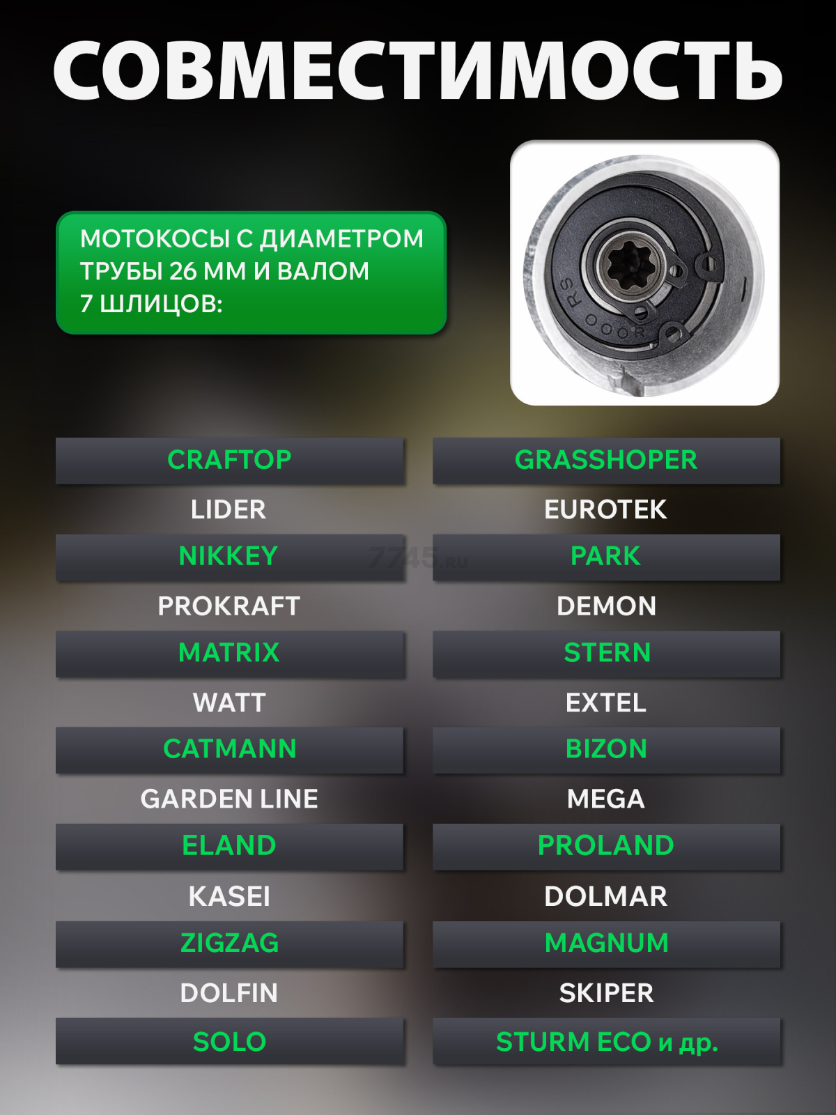 Подходит ко многим мотокосам: CRAFTOP, LIDER, NIKKEY, PROKRAFT, MATRIX, WATT, CATMANN, GARDEN LINE, ELAND KASEI, ZIGZAG, DOLFIN, SOLO, GRASSHOPER, EUROTEK, PARK, DEMON, STERN, EXTEL, BIZON, MEGA, PROLAND, DOLMAR, MAGNUM, SKIPER, STURM ECO и др.