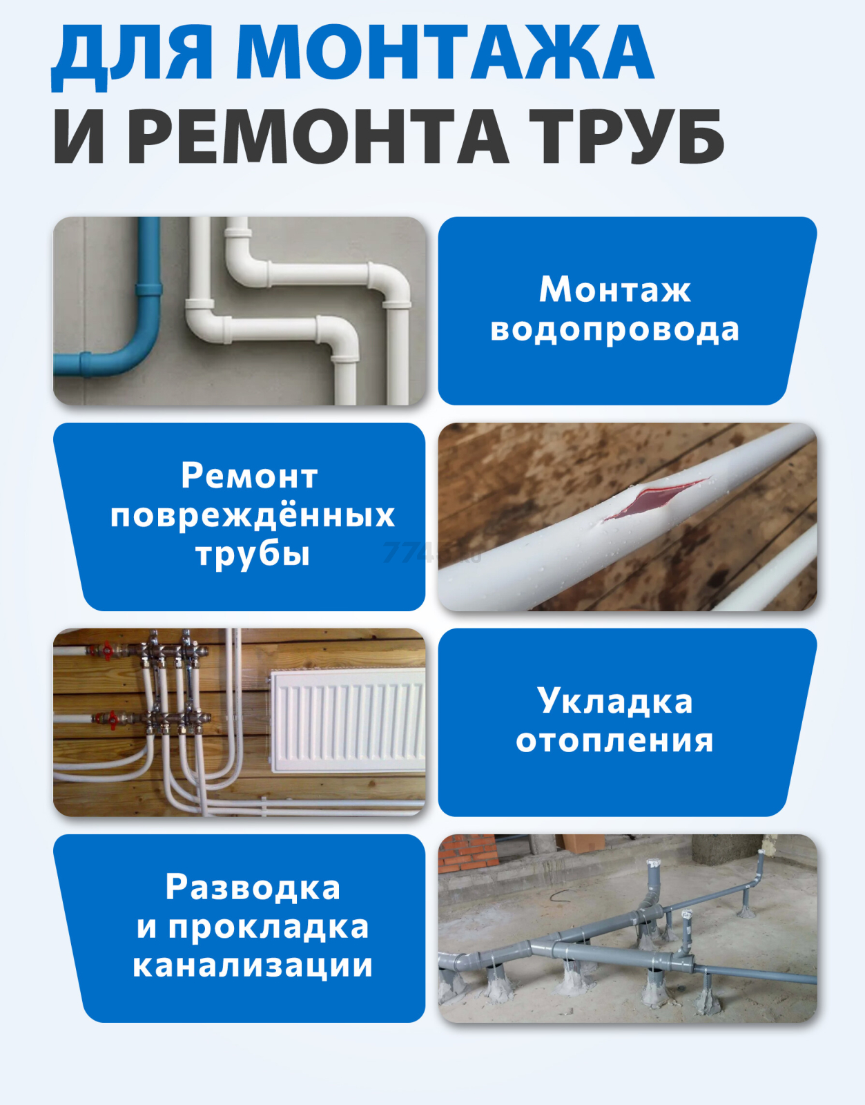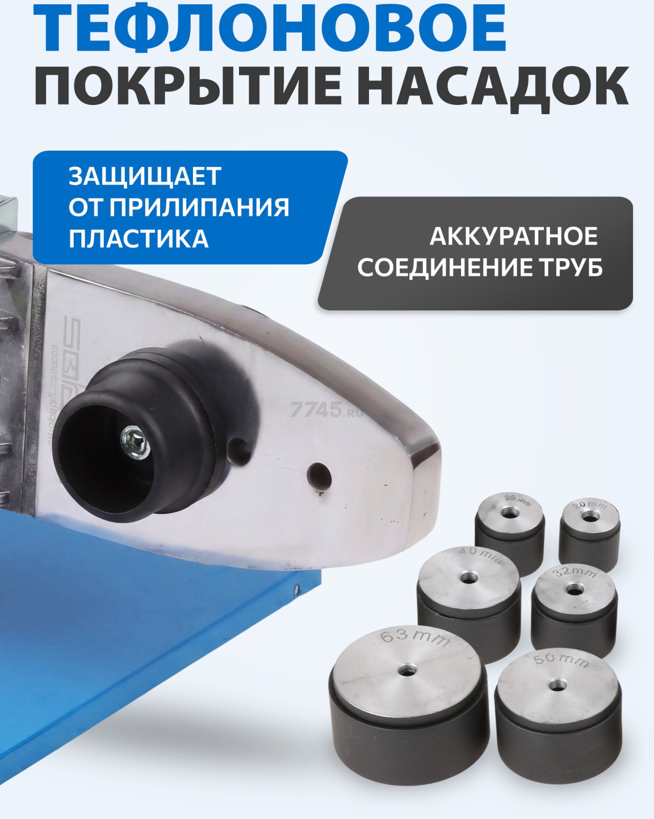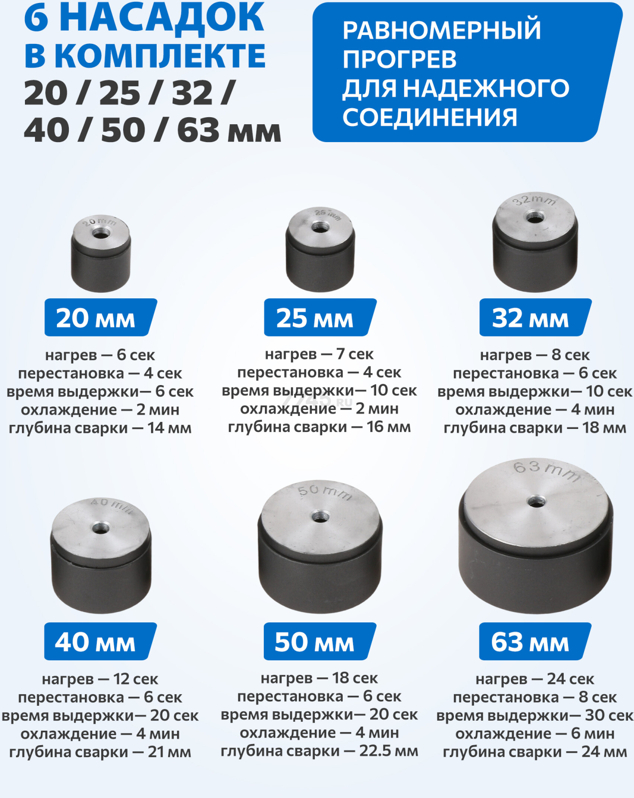 6 насадок: 20, 25, 32, 40, 50, 63 мм.