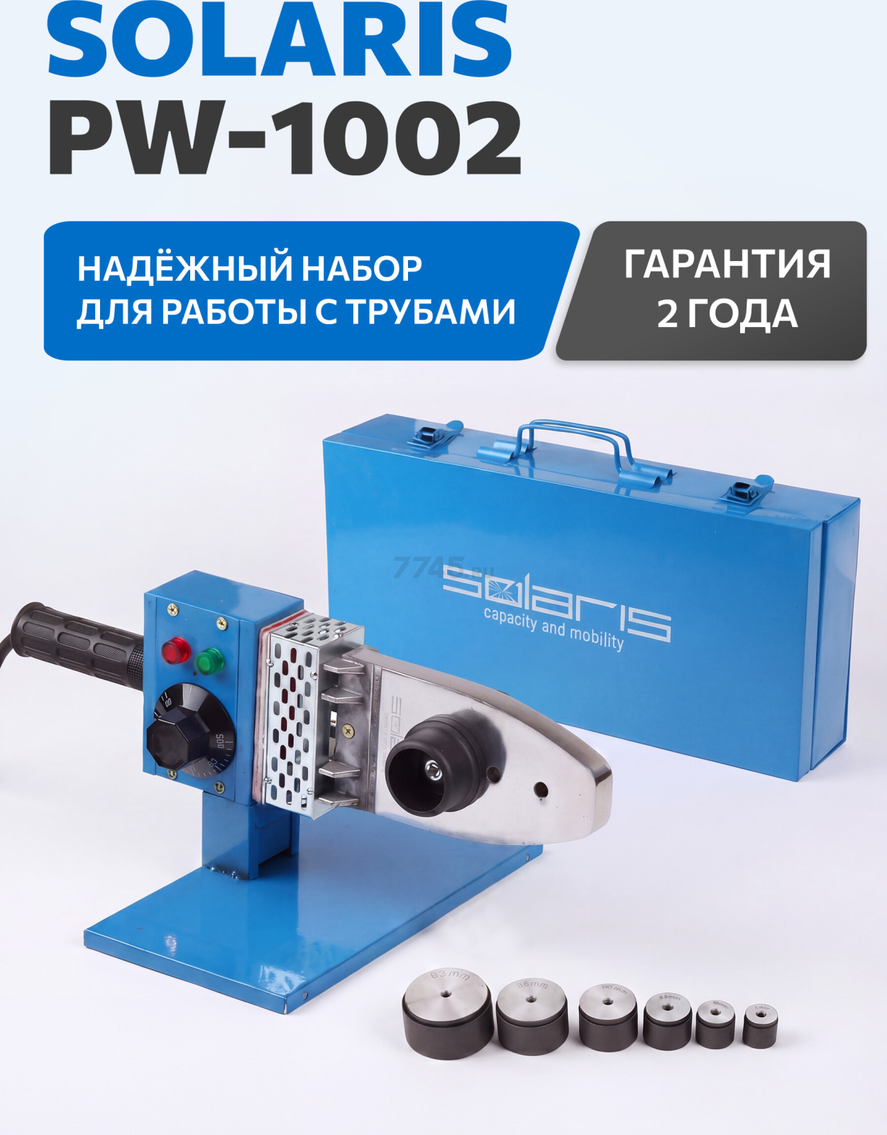 Сварочный аппарат для полимерных труб SOLARIS PW-1002 мощностью 1000 Вт с регулировкой температуры и оснащенный 6-ю насадками от 20 до 63 мм - оптимальный выбор для проведения разнообразных сантехнических работ.