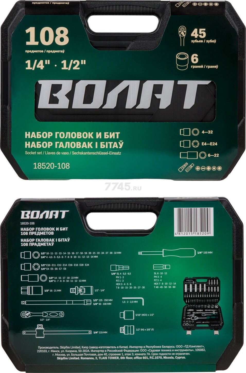 Набор инструментов 1/4", 1/2" 6 граней 108 предметов ВОЛАТ (18520-108) - многофункциональный набор предназначен для ремонта и обслуживания автомобиля. Рабочие части изготовлены из инструментальной стали. Покрытие сатинированное. Профиль головок шестигранный. Кейс из прочного противоударного пластика, с металлическими замками.