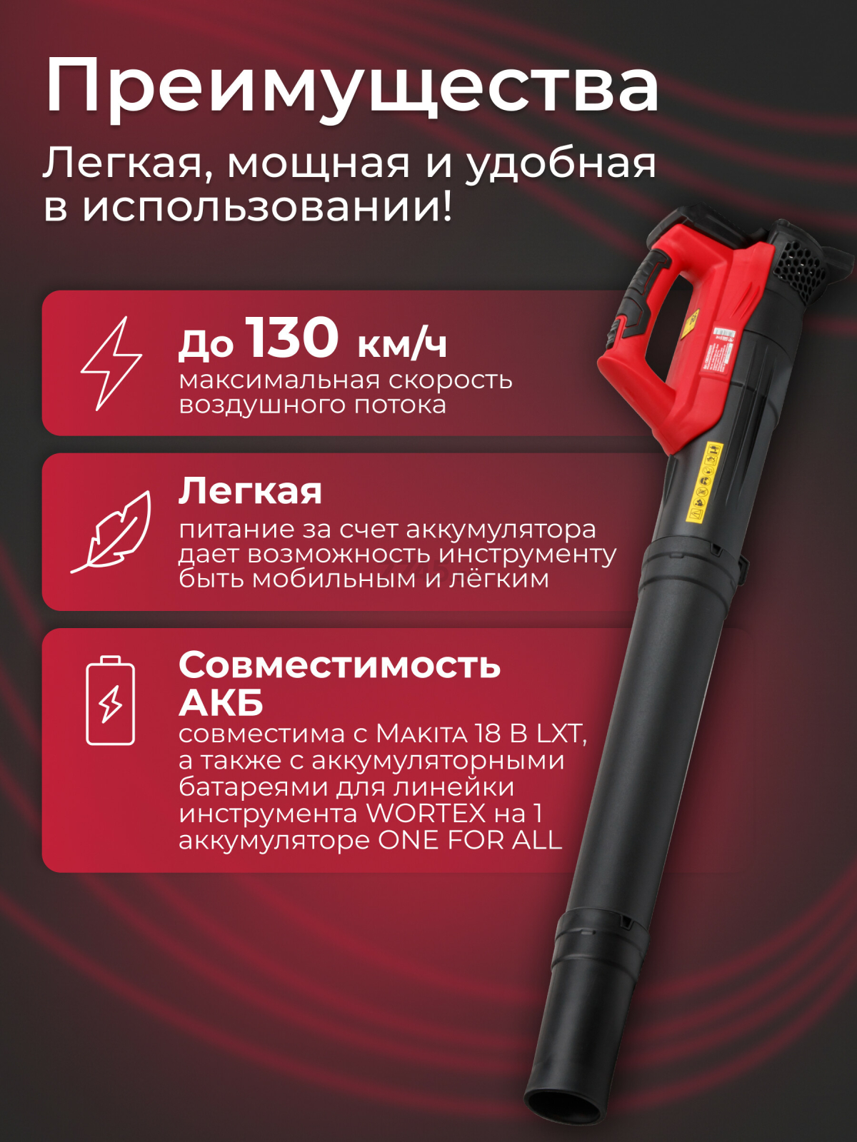 Воздуходувка аккумуляторная WORTEX BB 2018 D XLT SOLO (CBB2018D0011) - это надежный инструмент, который предназначен для работ на дачном участке или в мастерской. Воздушный поток быстро и качественно сдувает листву и прочий мусор. Обладает улучшенной эргономикой. Питание за счет аккумулятора дает возможность инструменту быть мобильным и лёгким.