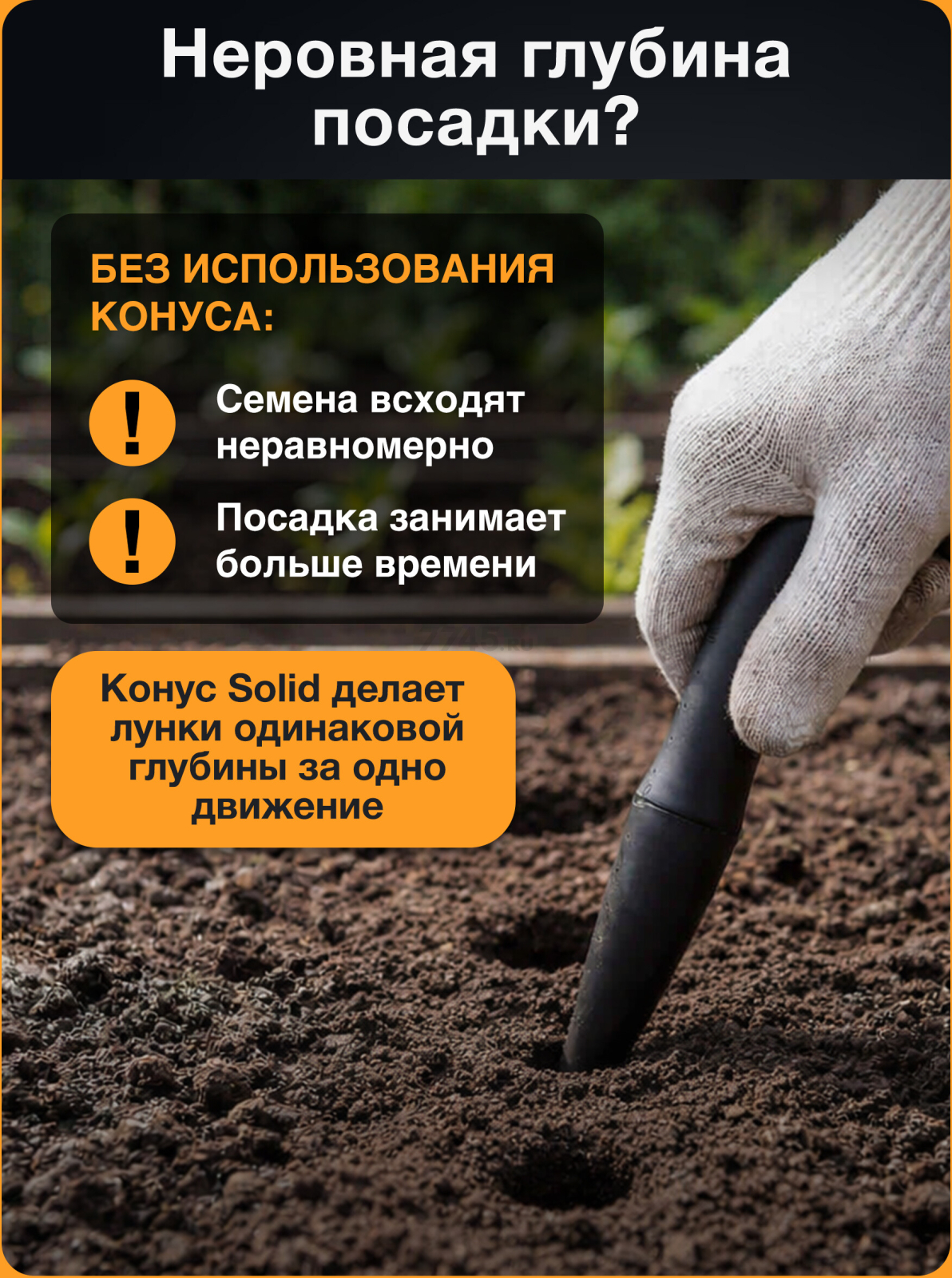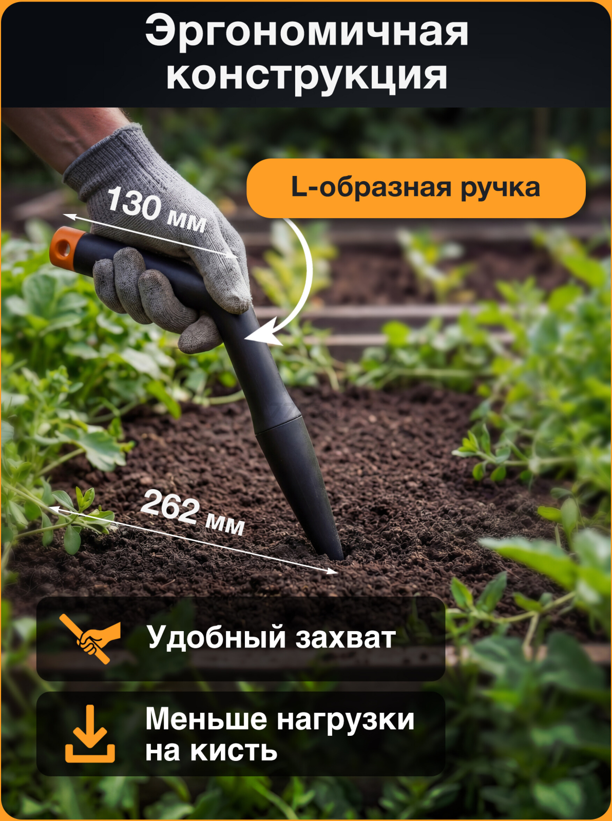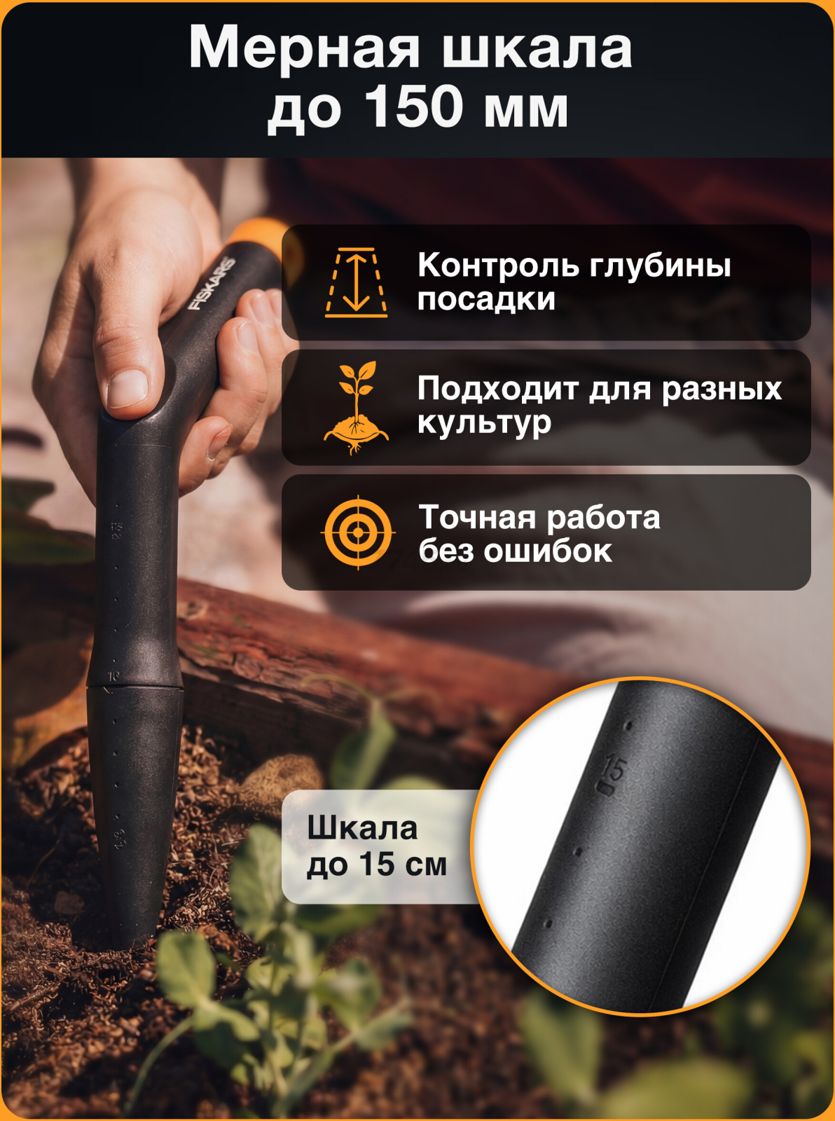Клин для посадки FISKARS Solid (1057080) позволит создат лунки для посадки семян на нужной глубине. Мерная шкала на конусе для посадки в глубину до 150 мм. L-образная фо. Как все инструменты серии SolidTM посадочный конус отличается легкостью и прочностью, а ее корпус из материала FiberComp устойчив к атмосферным воздействиям и легко чистится.