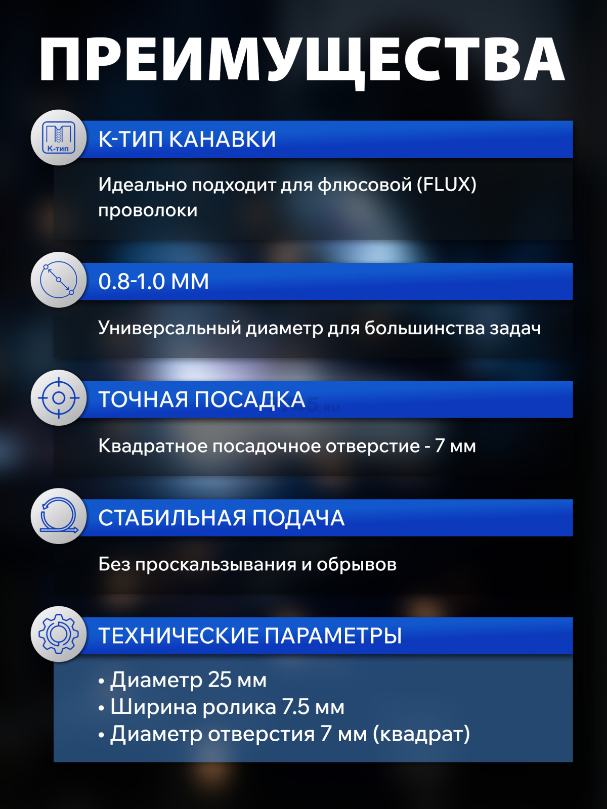 Ролик подающий для проволоки SOLARIS 0,8-1,0 мм K-тип (WA-2432) подходит под один из типов пластиковых механизмов подачи проволоки с пластиковым быстросъемным фиксатором ролика. Канавки под проволоку K-типа подходят под флюсовую (FLUX) проволоку для сварки без газа.