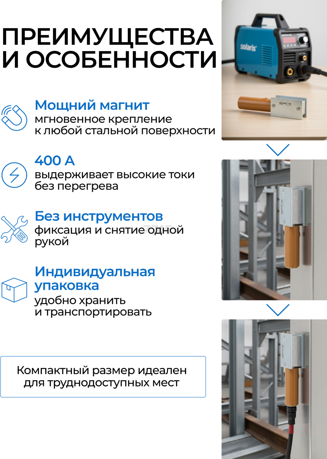 Клемма заземления SOLARIS E-400M (SL1570-6) с магнитным зажимом предназначена для подключения кабеля массы сварочного аппарата к свариваемой детали. За счет магнита клемму легко присоединить к металлическим поверхностям разных форм и размеров. Поставляется в индивидуальной цветной картонной упаковке.