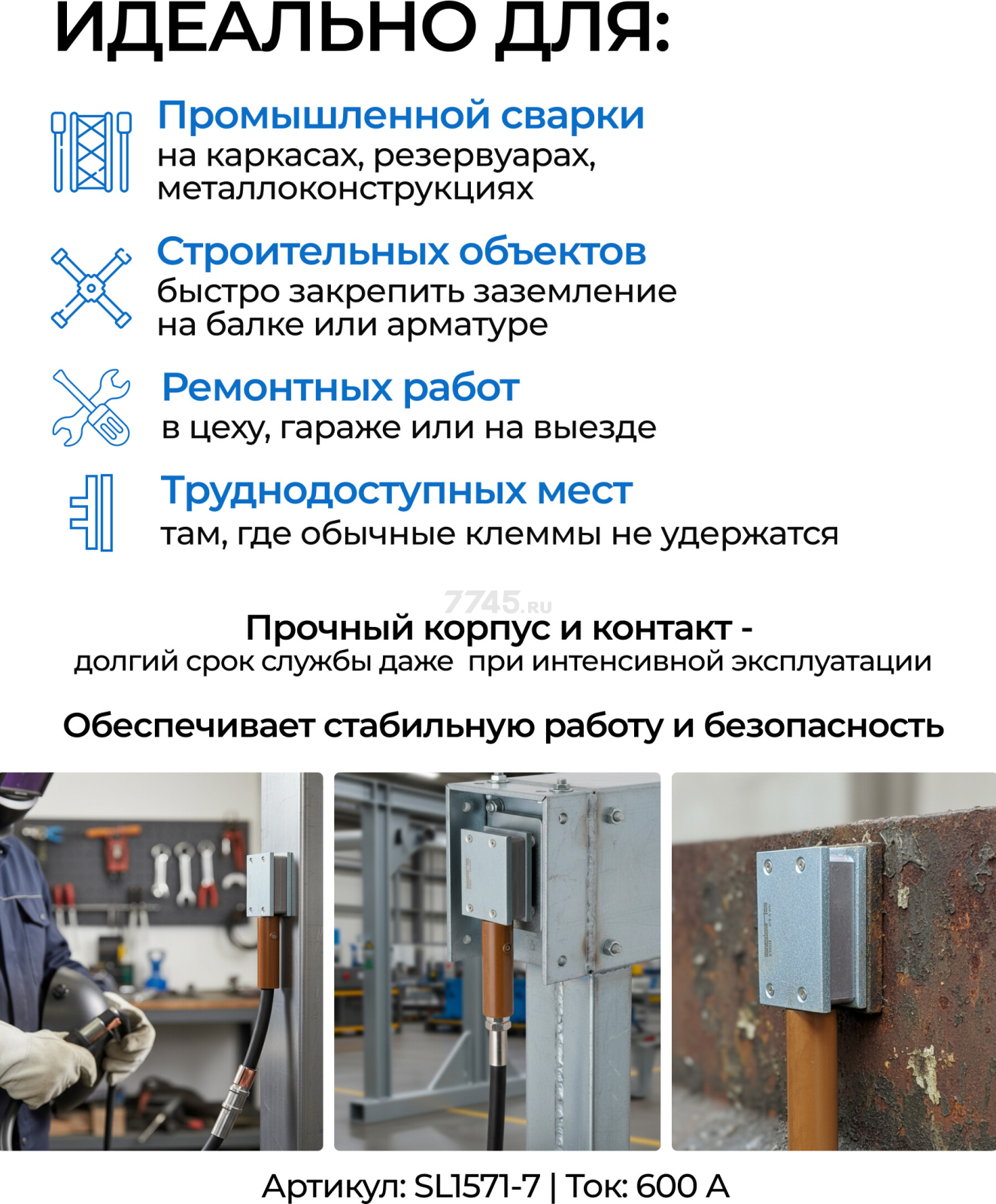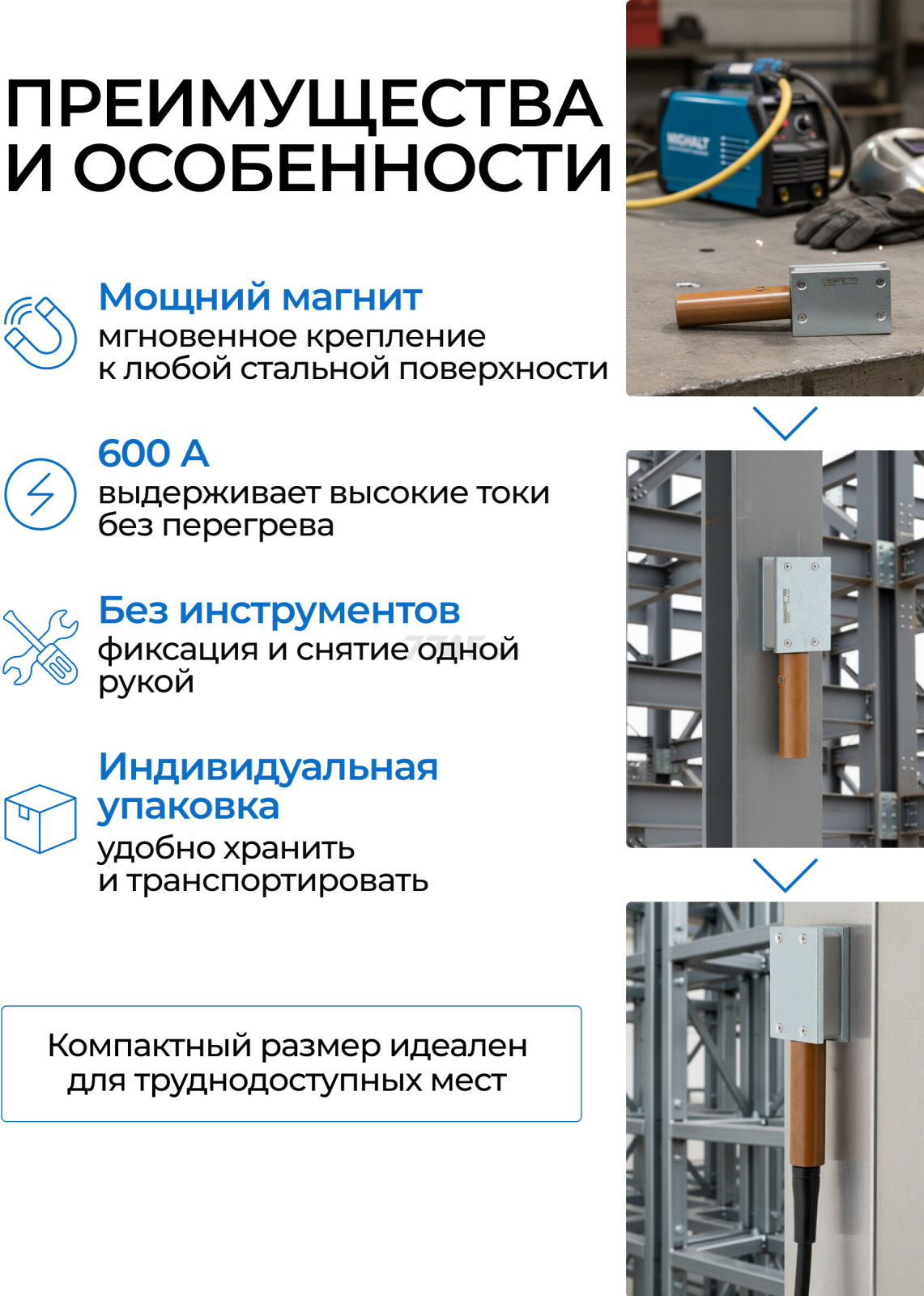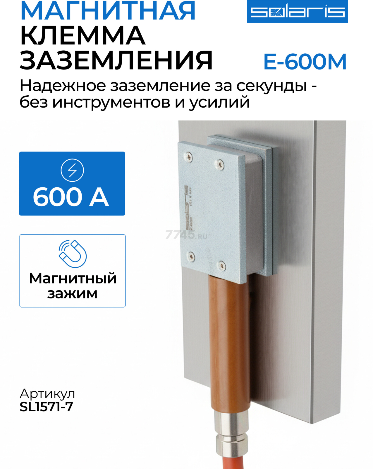 Клемма заземления SOLARIS E-600M (SL1571-7) с магнитным зажимом предназначена для подключения кабеля массы сварочного аппарата к свариваемой детали. За счет магнита клемму легко присоединить к металлическим поверхностям разных форм и размеров. Поставляется в индивидуальной цветной картонной упаковке.