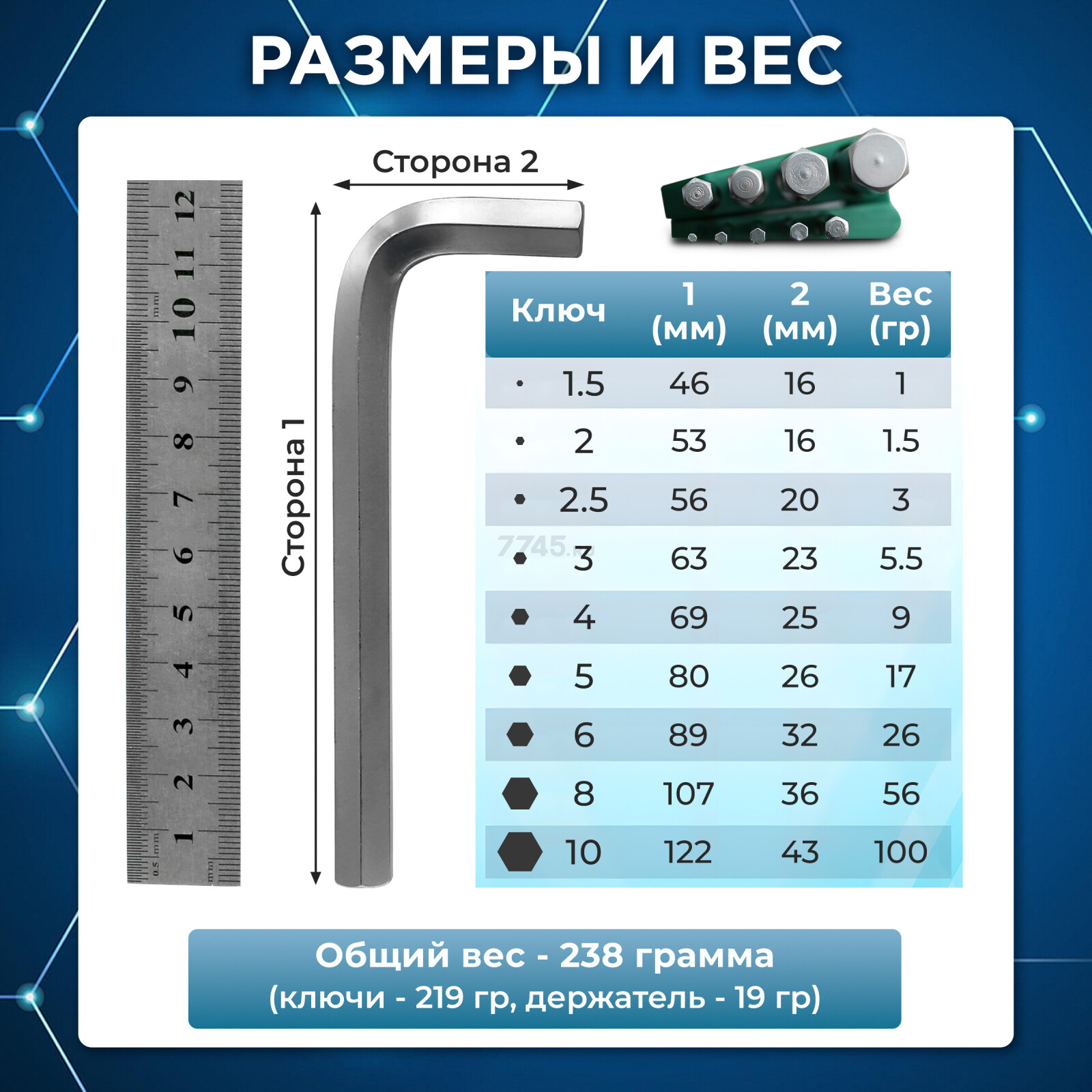| Размер ключа (основной) | 1.5 мм, 2 мм, 2.5 мм, 3 мм, 4 мм, 5 мм, 6 мм, 8 мм, 10 мм |