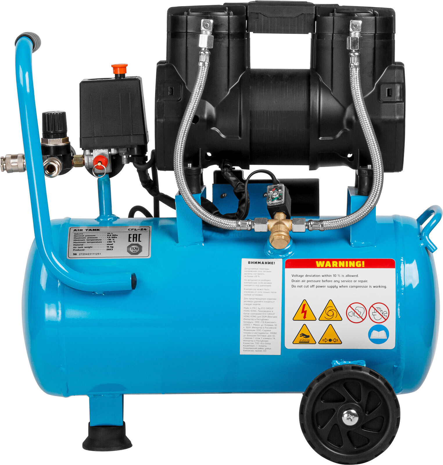 Устройство имеет горизонтальную компоновку ресивера объемом 24 литра, что позволяет хранить в нем достаточное количество сжатого воздуха для продолжительной работы. Манометры давления на входе и выходе, а также регулятор давления позволяют точно контролировать параметры воздуха.