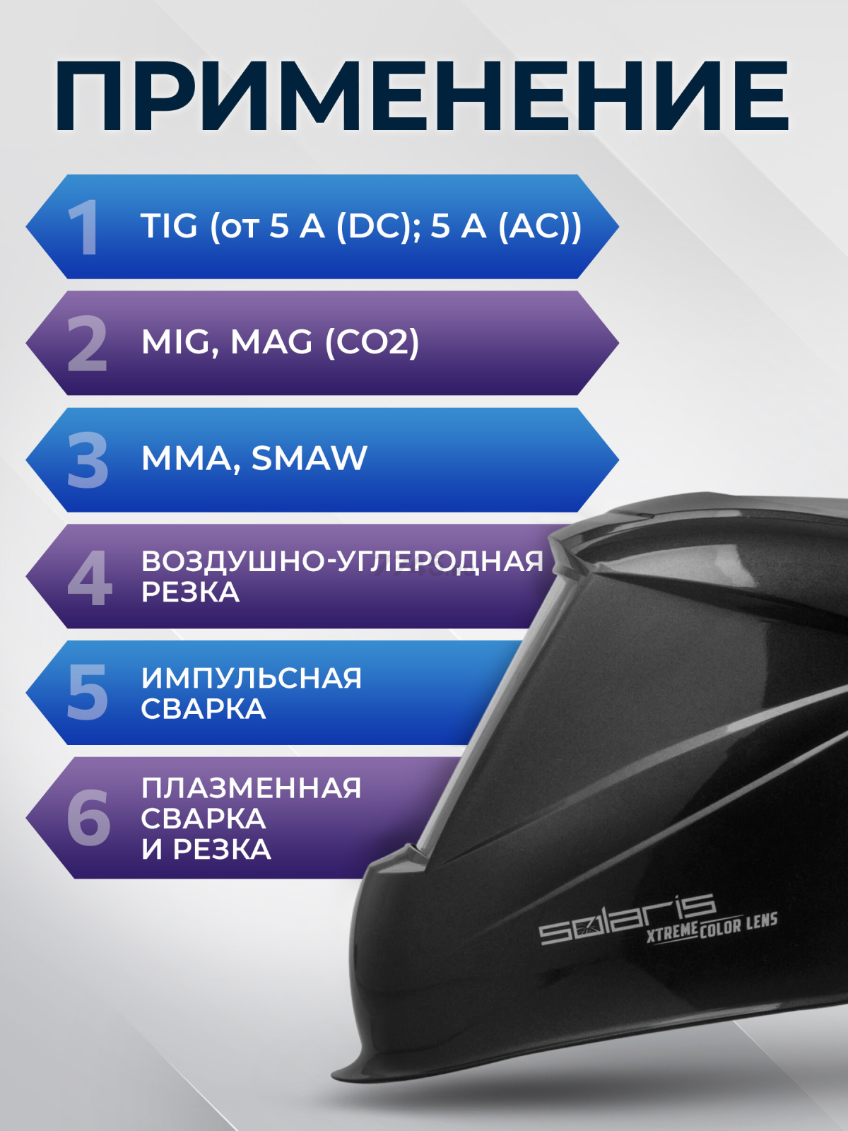 Маска сварочная хамелеон SOLARIS ASF820X (SL5717-2) оснащена качественным светофильтром с 4 фотосенсорами, что позволяет проводить сварочные работы даже на небольших токах в режиме TIG. Технология естественной передачи цветов XtremeColorLens позволяет передавать цвета более естественными, по сравнению со стандартными фильтрами-хамелеонами, где преимущественно преобладает зеленый свет.