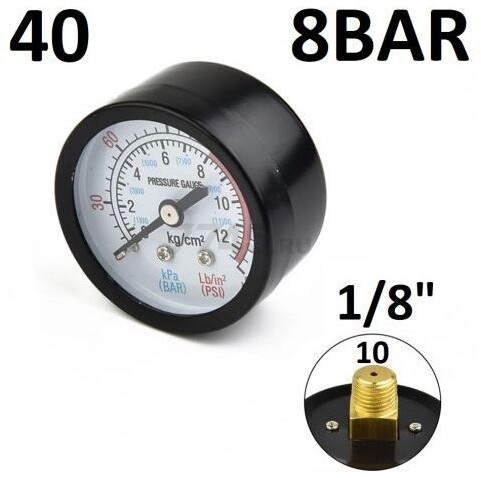 Манометр для компрессора DSG AC-150C (AC-150C-55) - с пластиковым корпусом. Диаметр - 40 мм. Наружная резьба 10мм 1/8". Рабочее давление - 8 бар.