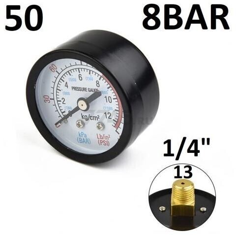 Манометр для компрессора DGM AC-150C (AC-150C-54) в пластиковом корпусе с резьбой 1/4" (13мм). Давление - 0-8 бар. Диаметр 50мм.