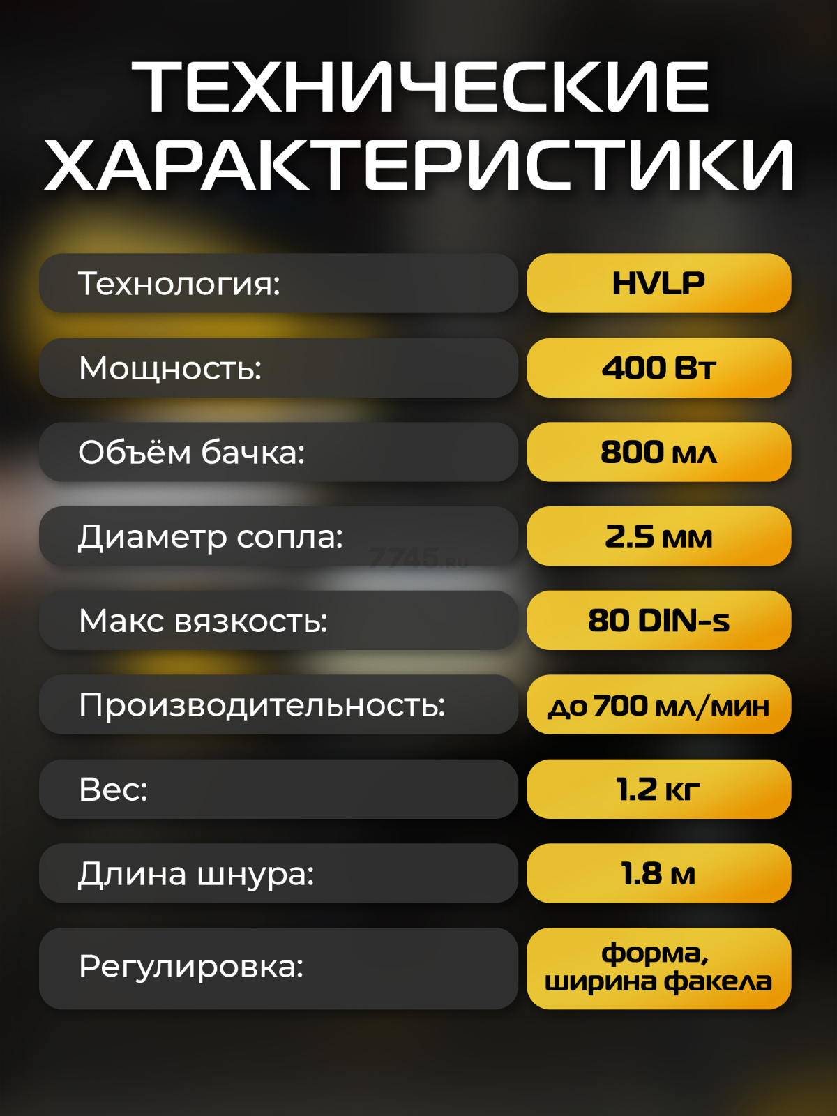 Модель оснащена функцией регулировки формы факела и технологией HVLP, которая обеспечит высокую производительность при низком давлении, делает покраску экономичной, уменьшая образование тумана в процессе работы и обеспечивая до 75% попадания материала на поверхность.