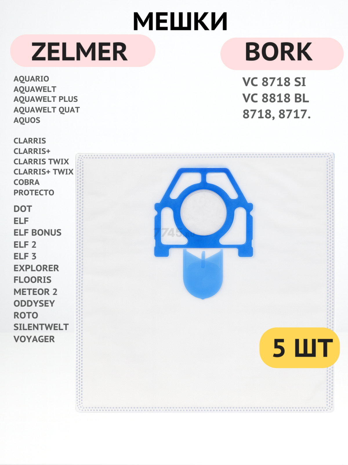 Описание товара Мешок для пылесоса Zelmer/Bork BRUNER 5 штук (MPVC-ZELM1)