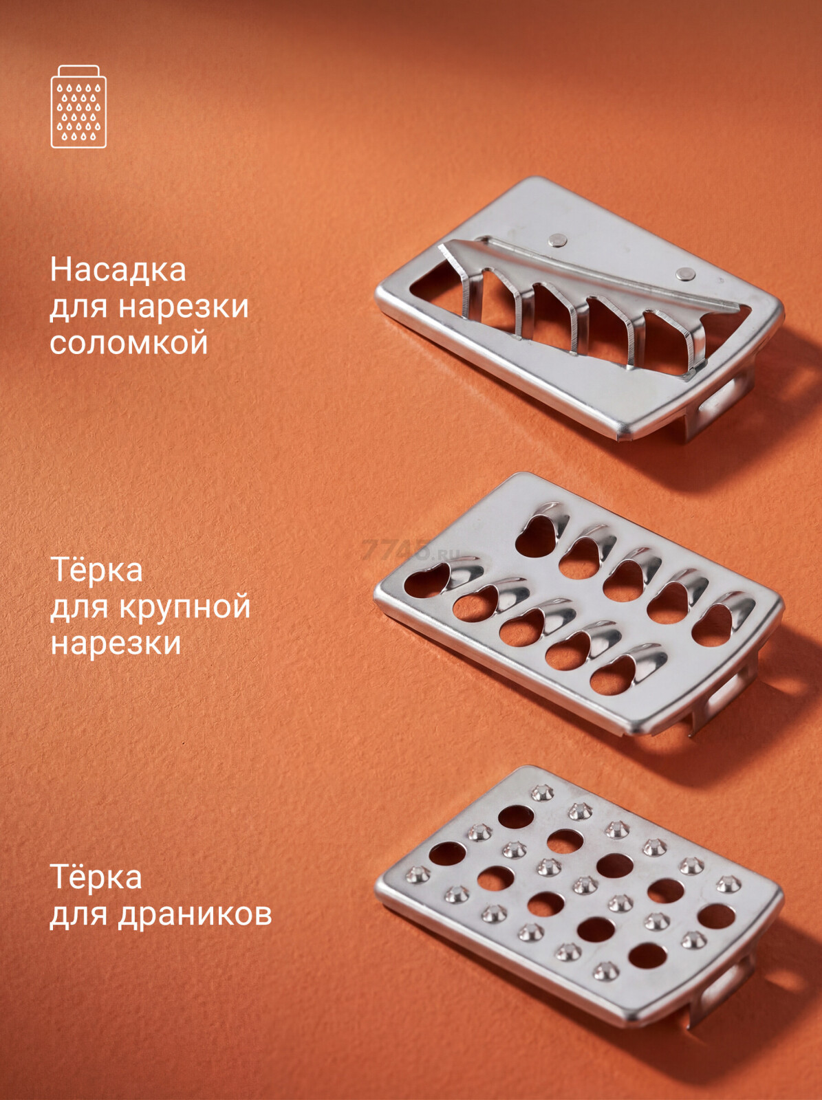 В комплект входят ножи из нержавеющей стали: - для крупной и мелкой шинковки; - для крупной и мелкой нарезки; - для волнистой нарезки; - для нарезки соломкой; - терка для приготовления данников.