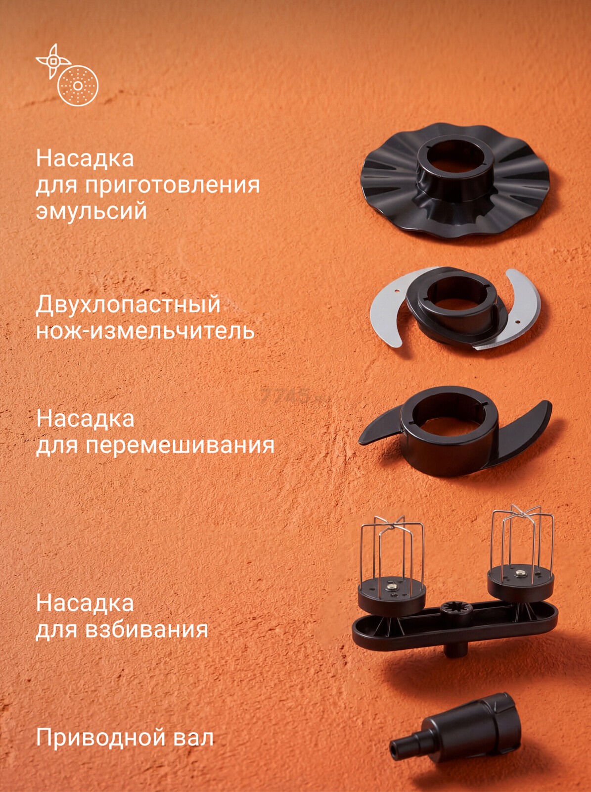 | Терка, Терка для драников, Насадка для нарезки ломтиками, Диск для нарезки соломкой, Универсальный нож, Блендер, Мельничка, Насадка для взбивания, Насадка для смешивания, Насадка-эмульгатор, Соковыжималка для цитрусовых | |