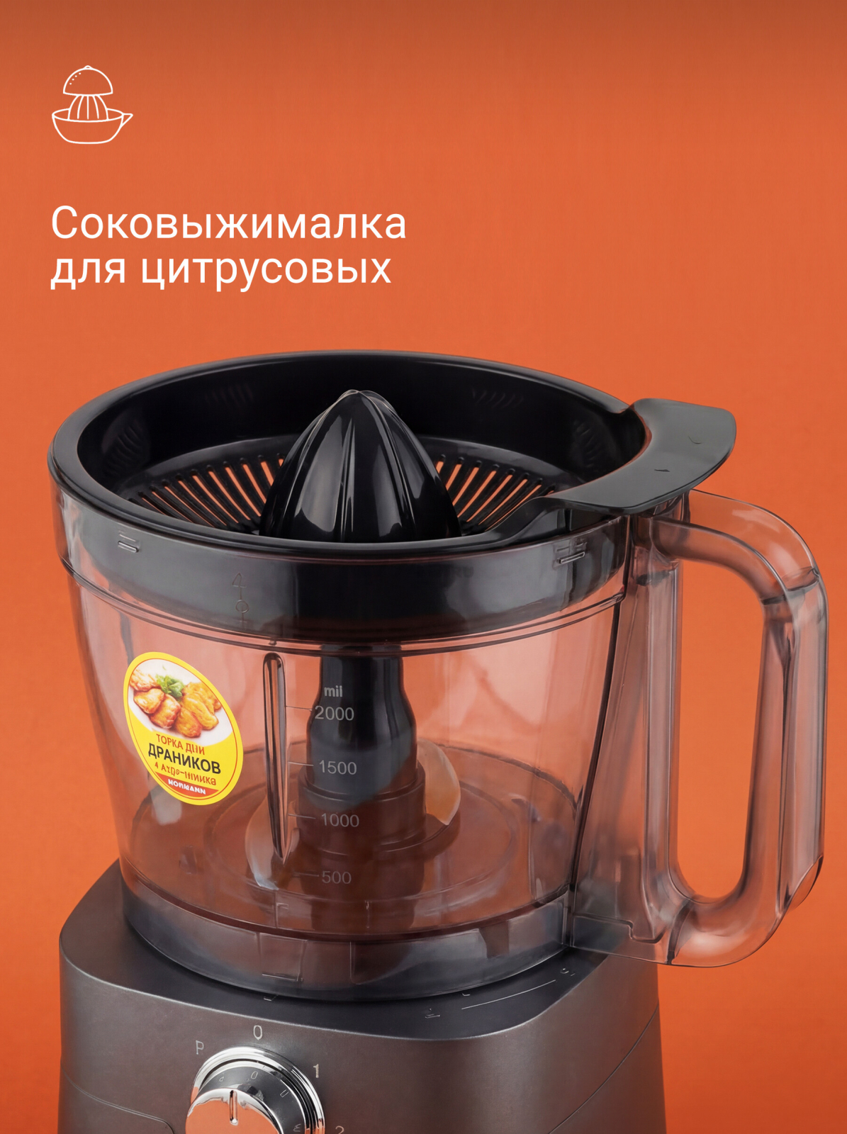 Насадка-венчик предназначена для взбивания жидких смесей, сливок и яичных белков. Цитрус-пресс позволяет быстро получить сок из свежих цитрусовых. Кофемолка (объем 200 мл) подходит для измельчения кофейных зерен и твердых круп.