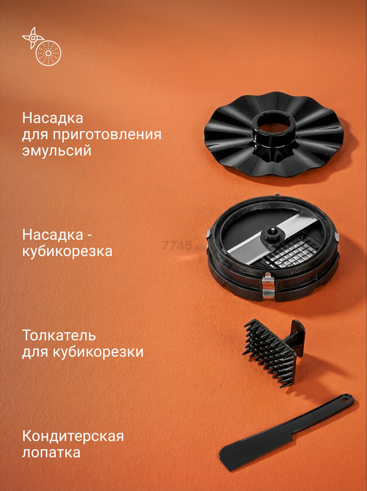 | Терка, Терка для драников, Диск для нарезки соломкой, Насадка для нарезки кубиками, Универсальный нож, Блендер, Мельничка, Насадка для взбивания, Насадка для смешивания, Насадка-эмульгатор, Соковыжималка для цитрусовых, Лопатка | |