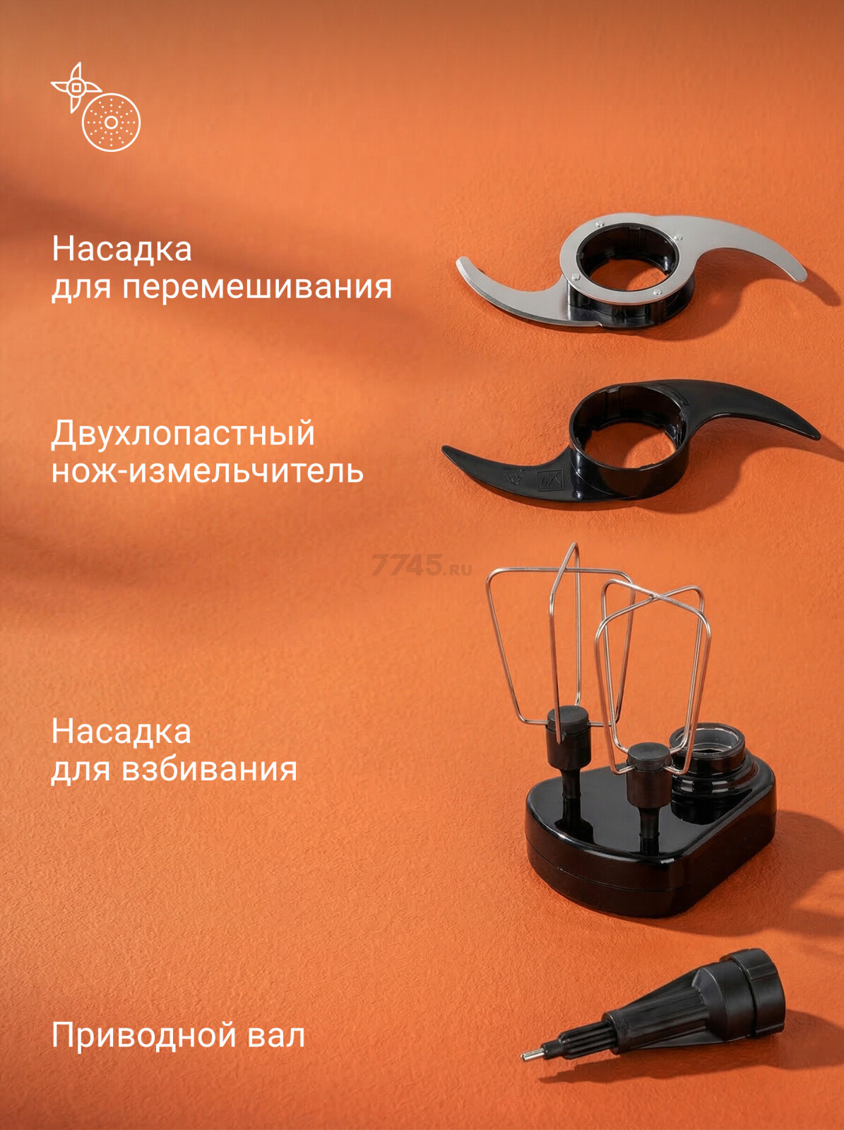 - Насадка для измельчения — подходит для овощей, зелени и мягких продуктов.