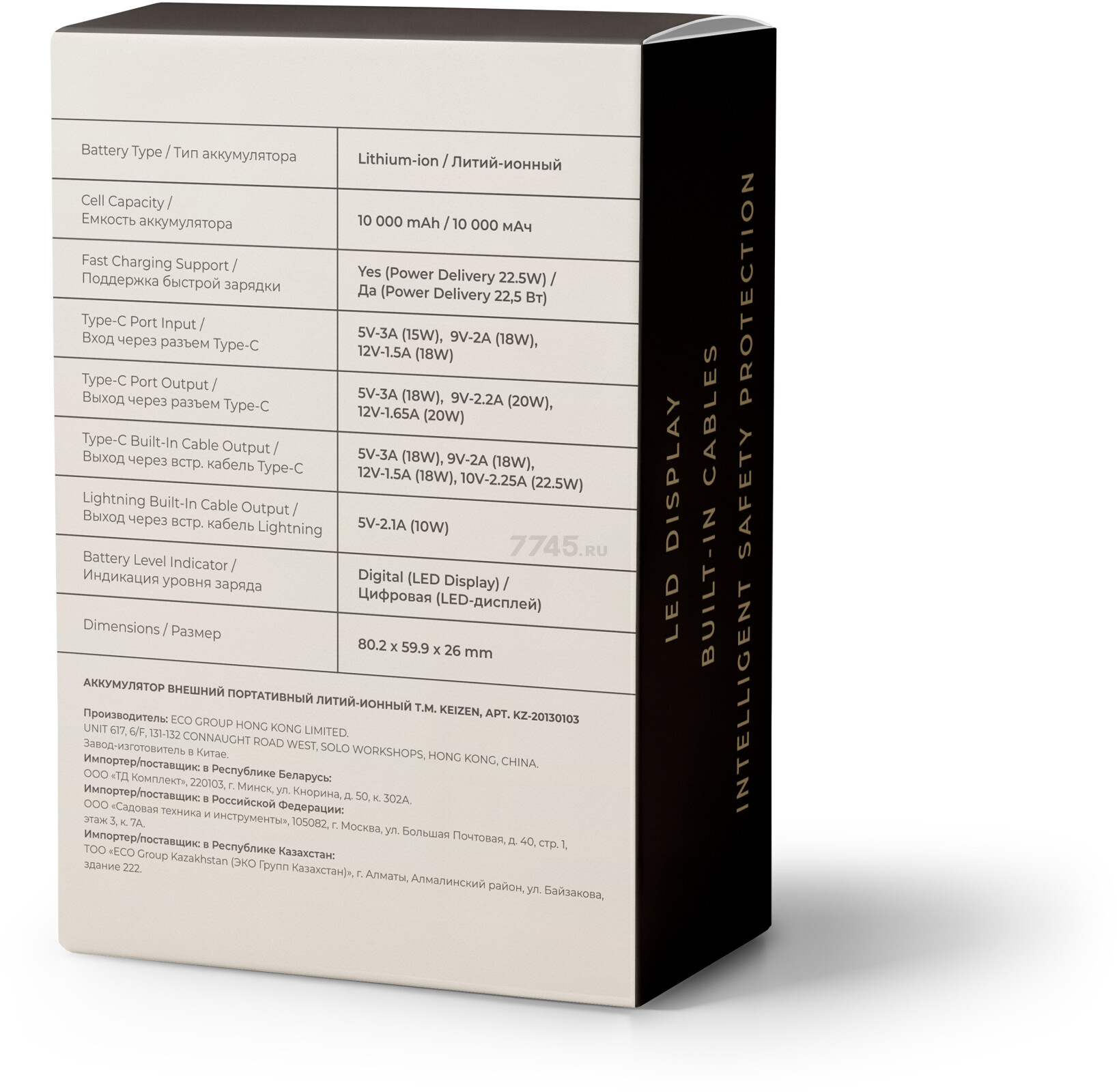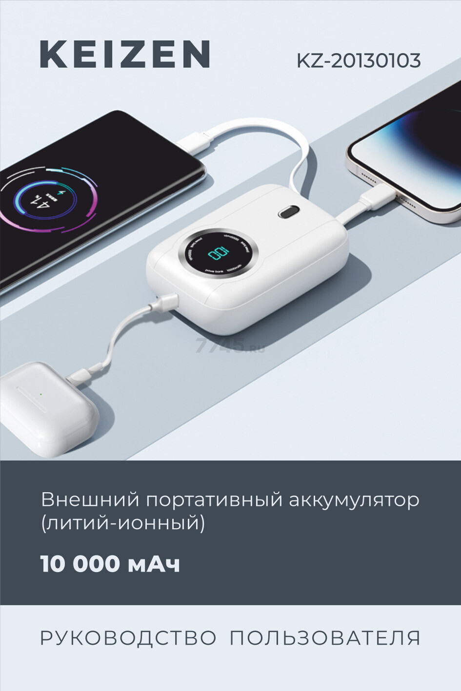 Power Bank KEIZEN KZ-20130103 — надежное портативное зарядное устройство, предназначенное для подзарядки смартфонов, планшетов, умных часов, беспроводных наушников, портативных колонок и электронных книг. Устройство оснащено аккумулятором емкостью 10 000 мАч и обеспечивает энергию заряда 37 Вт·ч, что позволяет быстро и безопасно восполнять заряд ваших устройств в дороге, дома или на работе.