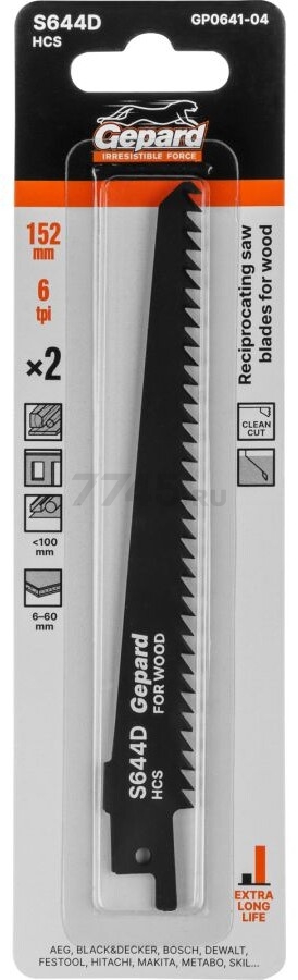 Полотно для сабельной пилы GEPARD по дереву S644D 152 мм 2 штуки (GP0641-04) - сменный пильный элемент для сабельных пил, используются для быстрых, аккуратных поперечных распилов дерева, фанеры, ДСП, пластика.