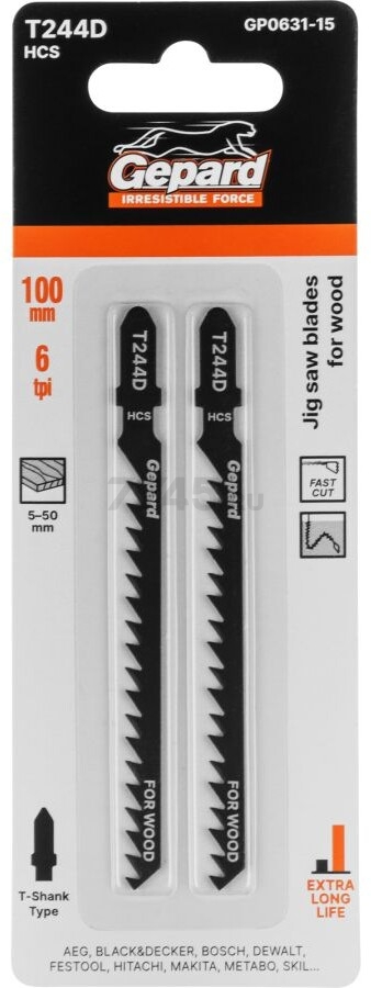 Пилка для электролобзика GEPARD по дереву T244D 2 штуки (GP0631-15) - сменный пильный элемент по дереву для электролобзиков. Используется для быстрых криволинейных пропилов в мягкой древесине (5-50 мм), ДСП, столярных плитах, ДВП. Пропил криволинейный, грубый, быстрый рез.