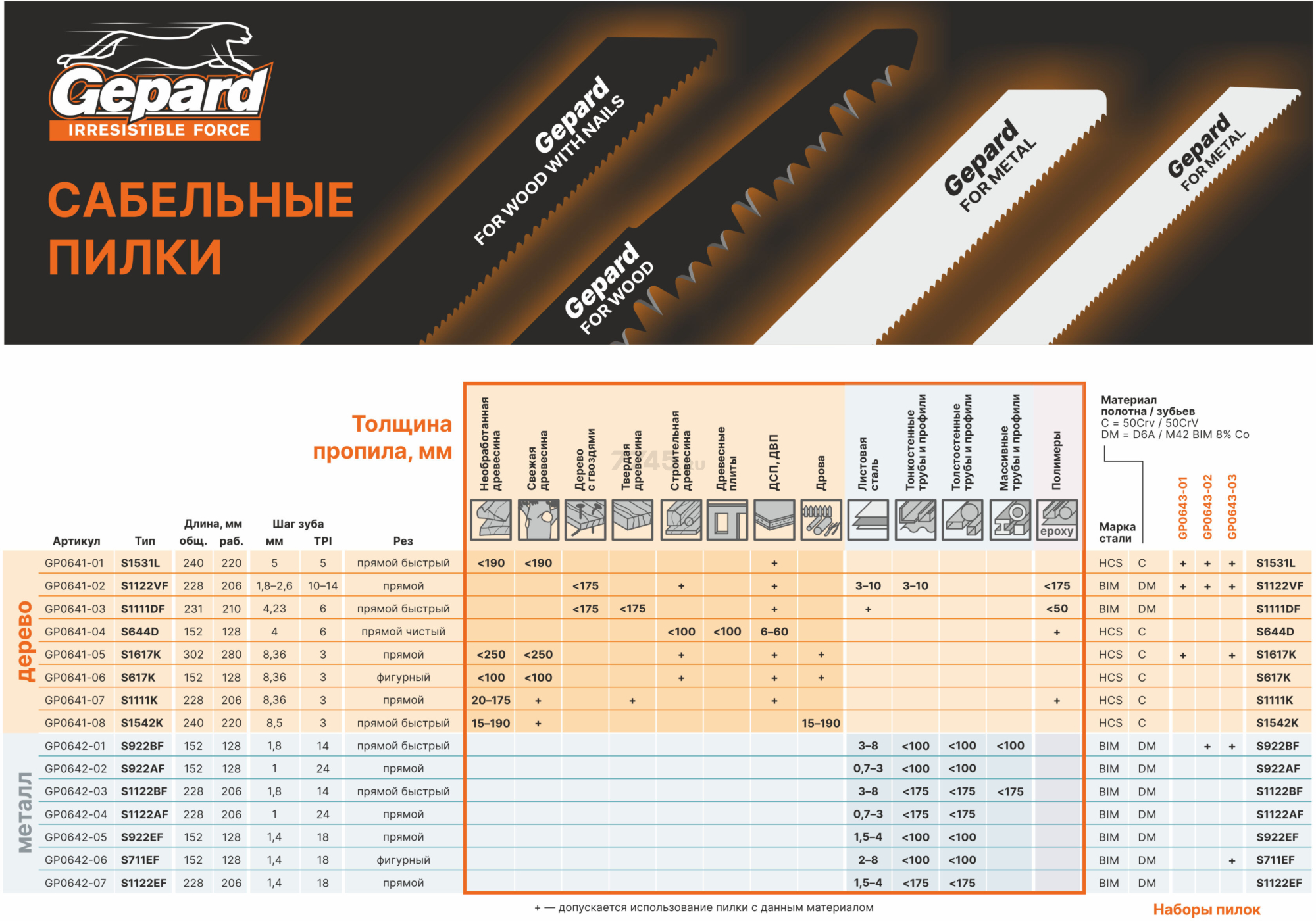 Описание товара Полотно для сабельной пилы GEPARD по дереву S1531L 240 мм 2 штуки (GP0641-01)