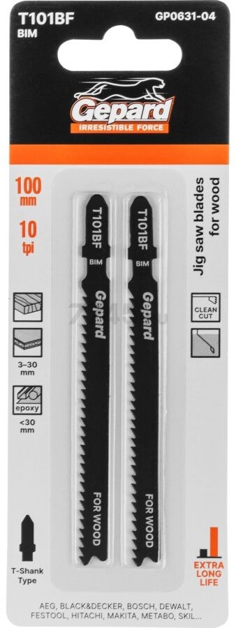 Пилка для электролобзика GEPARD по дереву T101BF2 штуки (GP0631-04) - сменный пильный элемент по ламинату для электролобзиков. Используются для работы с мягкой и твердой древесиной, облицовочными панелями, полимерными/эпоксидными материалами, ламинатом, толщиной 3-30 мм. Пропил прямой, тонкий, аккуратный и чистый рез.