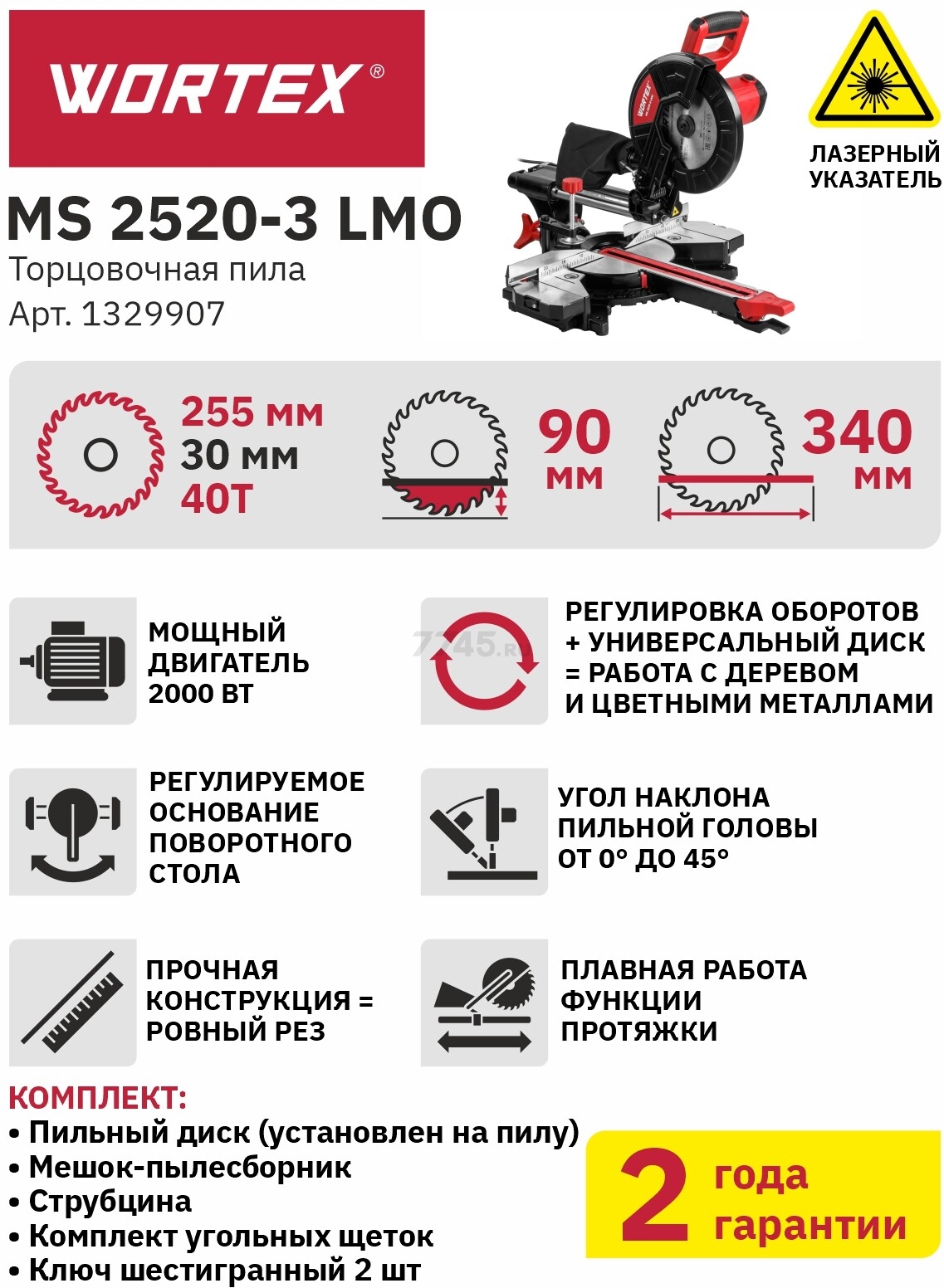 Пила торцовочная WORTEX MS 2520-3 LMO (1329907) отличается наличием двух скоростей и универсального диска, благодаря чему она подойдёт для резки древесины и цветных металлов. К её преимуществам относятся: мощный двигатель с высокой производительностью, система пылеудаления, лазерный указатель для повышения точности реза, металлические скользящие полозья, плавный ход, система удобного зажима заготовки, точный рез, быстрая регулировка глубины и ширины реза, а также большая глубина и ширина реза.