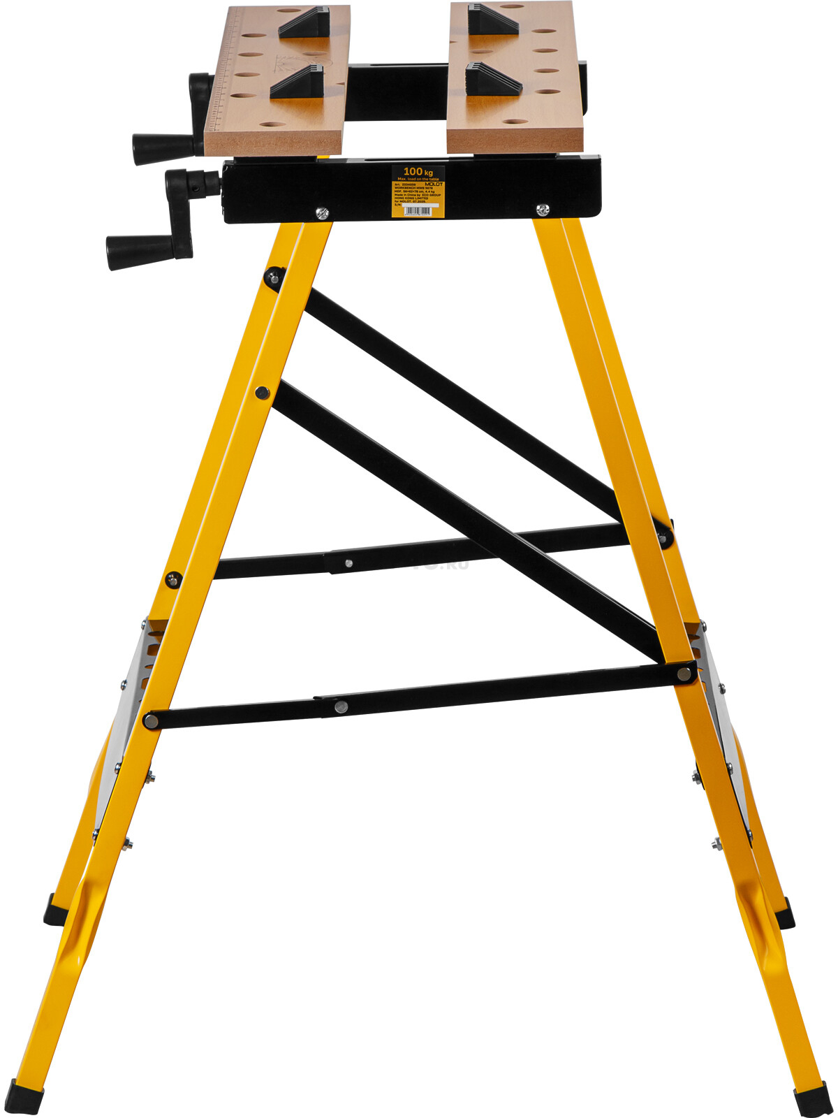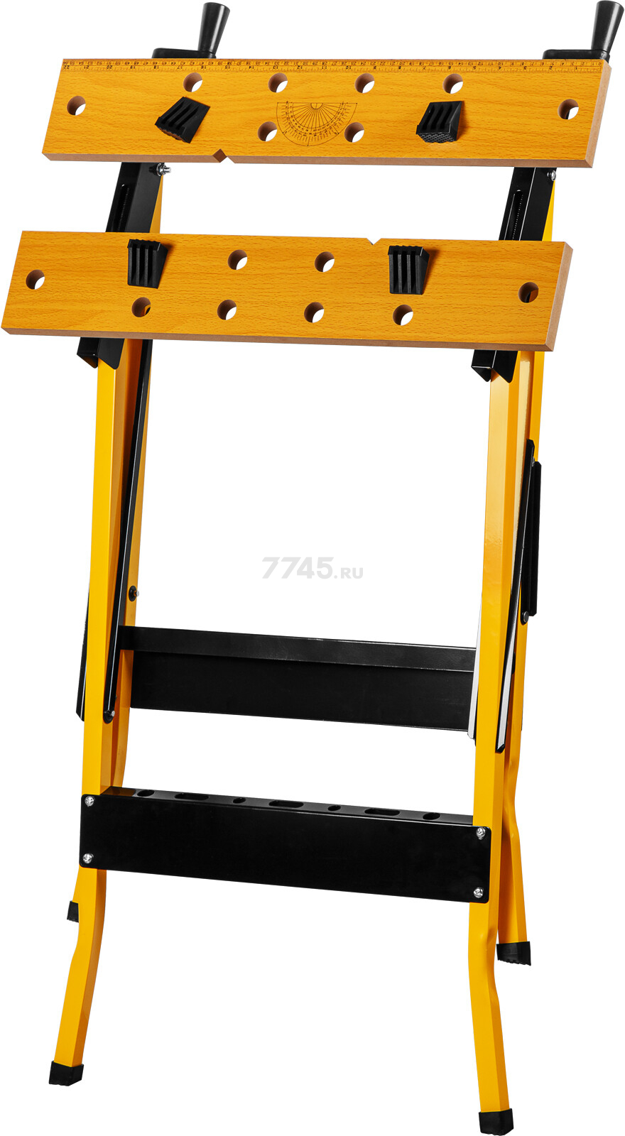 Столешница имеет ряд отверстий для установки клиньев-упоров, что расширяет ваши возможности при обработке деталей, также на столешницу нанесена разметка (линейка и транспортир), что позволяет быстро и точно выполнять разметку заготовок прямо на месте, не прибегая к дополнительным инструментам.