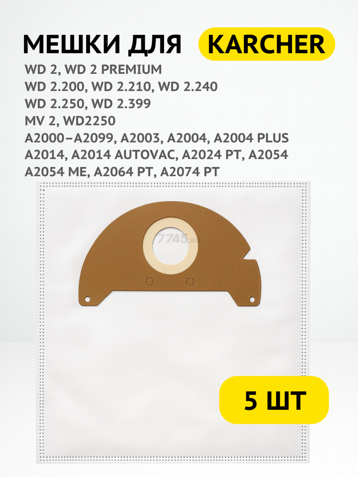 Совместимость: Karcher WD 2, WD 2 Premium, WD 2.200, WD 2.210, WD 2.240, WD 2.250, WD 2.399, MV 2, WD2250, A2000–A2099, A2003, A2004, A2004 Plus, A2014, A2014 AutoVac, A2024 PT, A2054, A2054 ME, A2064 PT, A2074 PT.