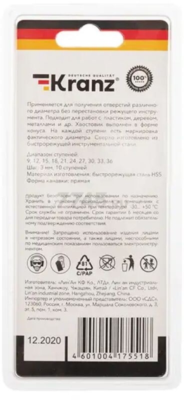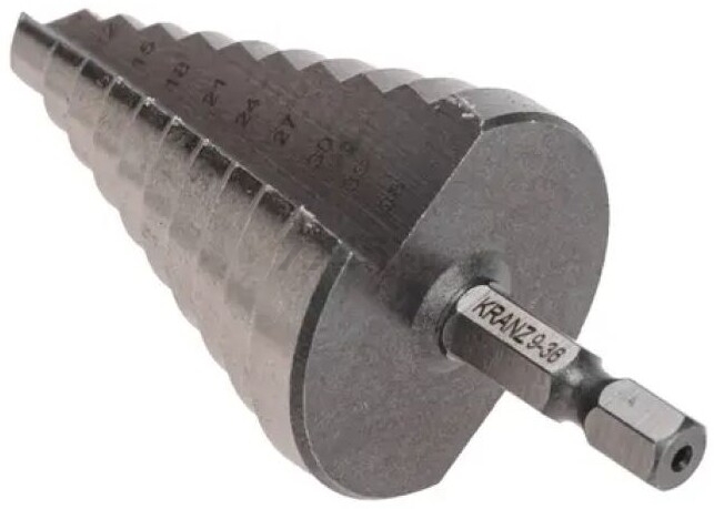 Сверло по металлу ступенчатое 9,0-36,0 мм KRANZ HRC 62 (KR-12-6604) применяется при выполнении монтажно-сборочных работ для сверления отверстий различных диаметров без перестановки режущего инструмента. Применяется в работе с такими материалами, как пластик, дерево, металл и др.