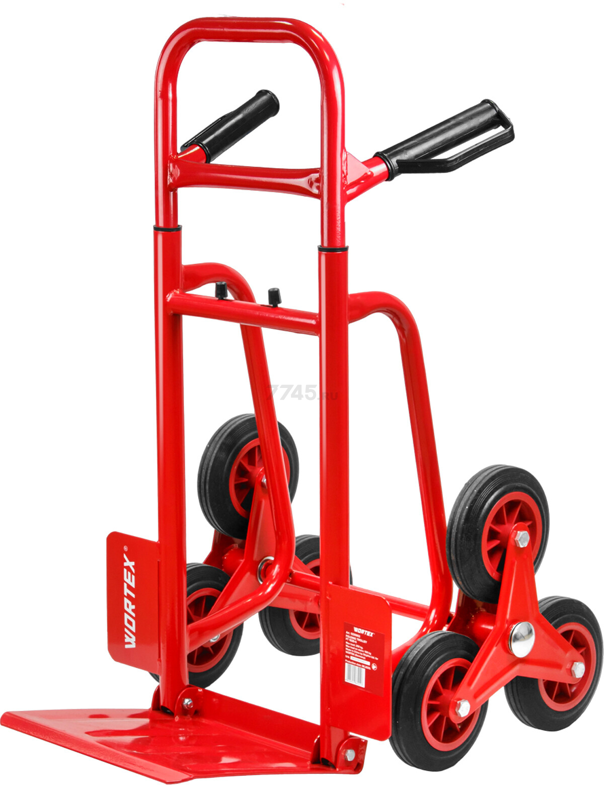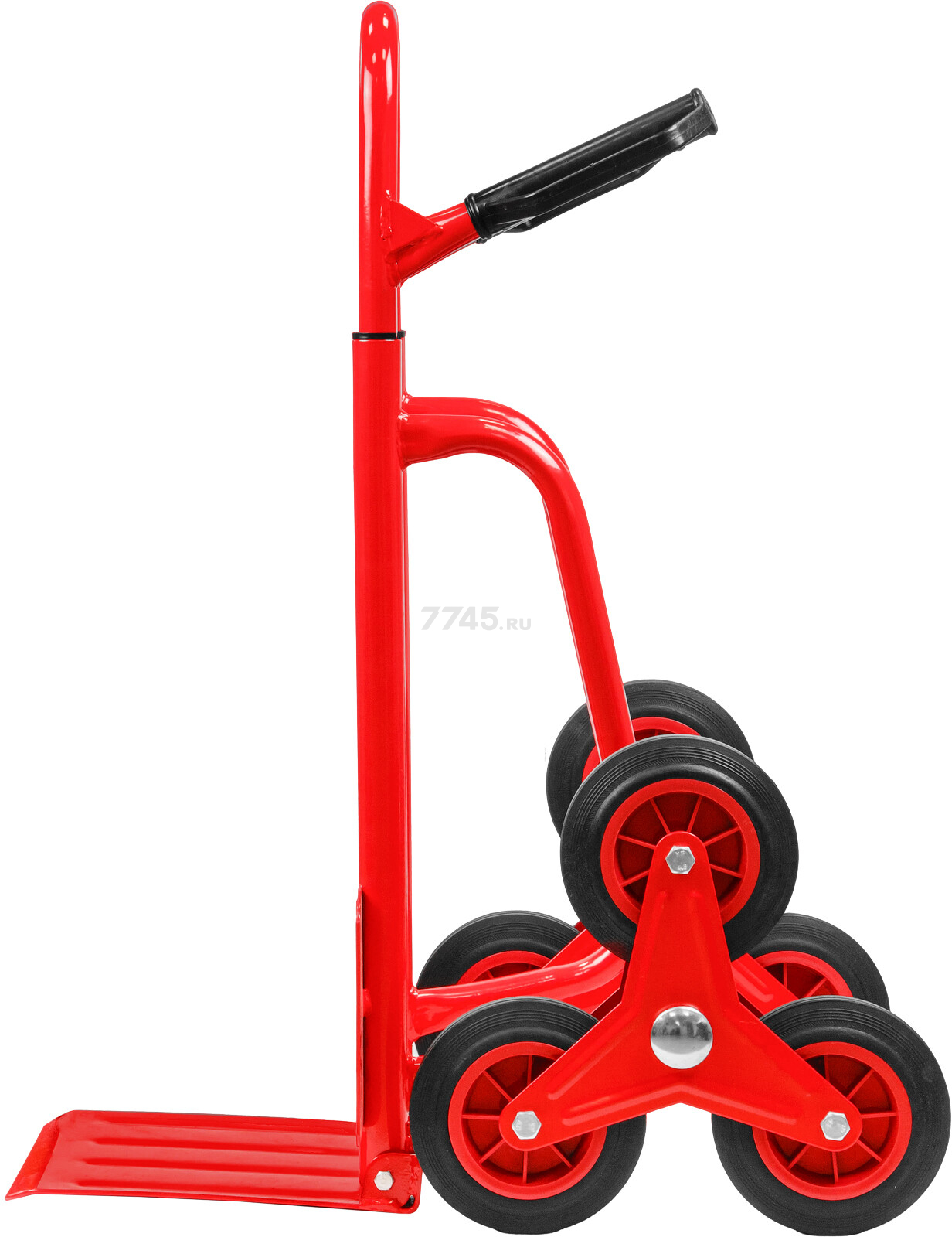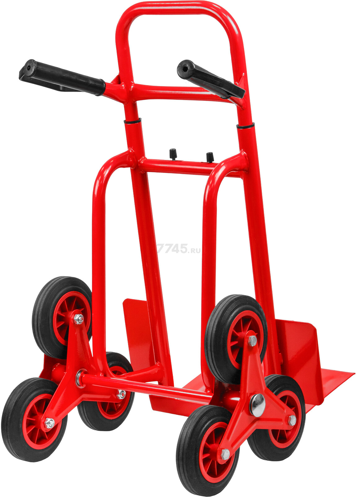 Тележка имеет 6-ти колесную базу, что позволяет перемещать по лестнице груз весом до 100 кг и на ровных плоскостях до 250 кг.