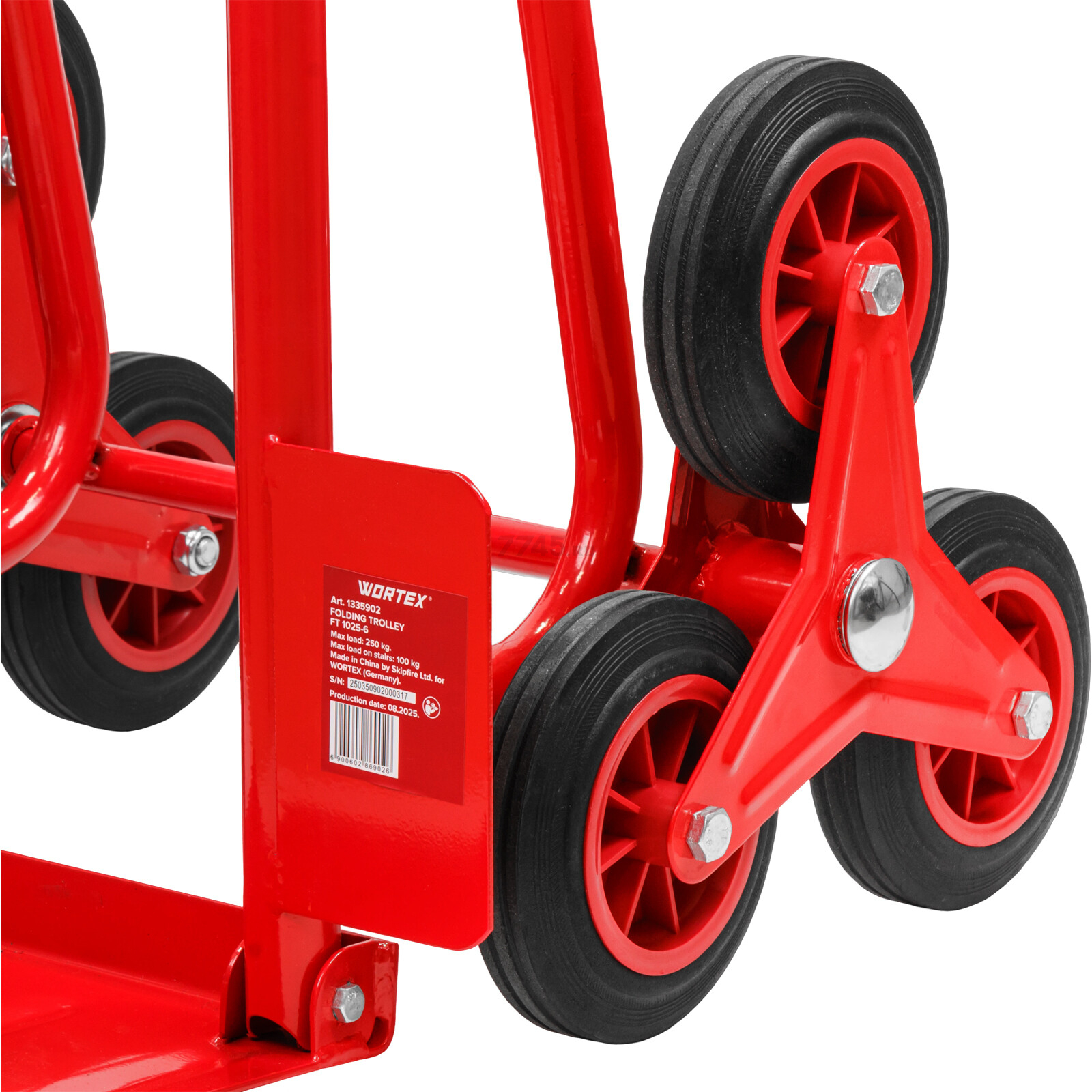 Шестиколесная база обеспечивает возможность перемещения грузов по ступеням. При подъеме или спуске по лестнице колесная опора перекатывается, последовательно опираясь на ступени. Диаметр каждого из шести колес составляет 155 мм.