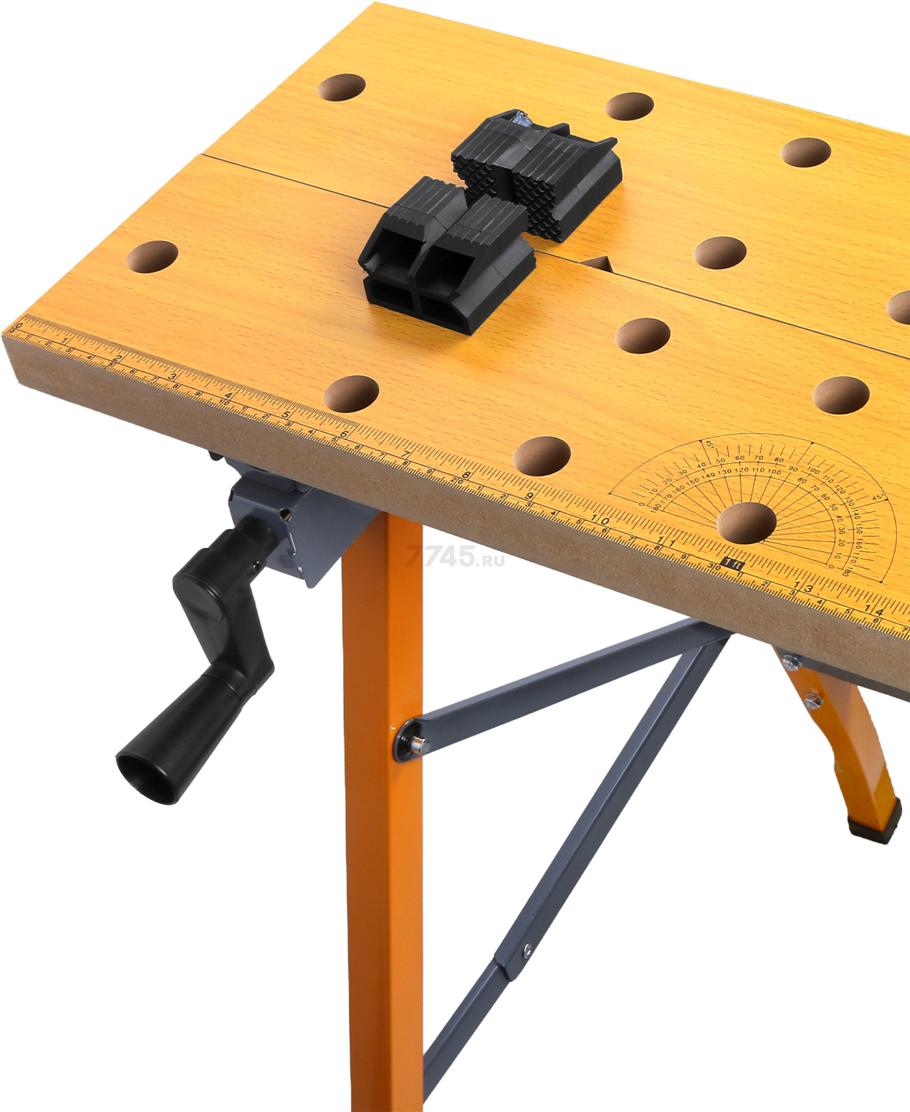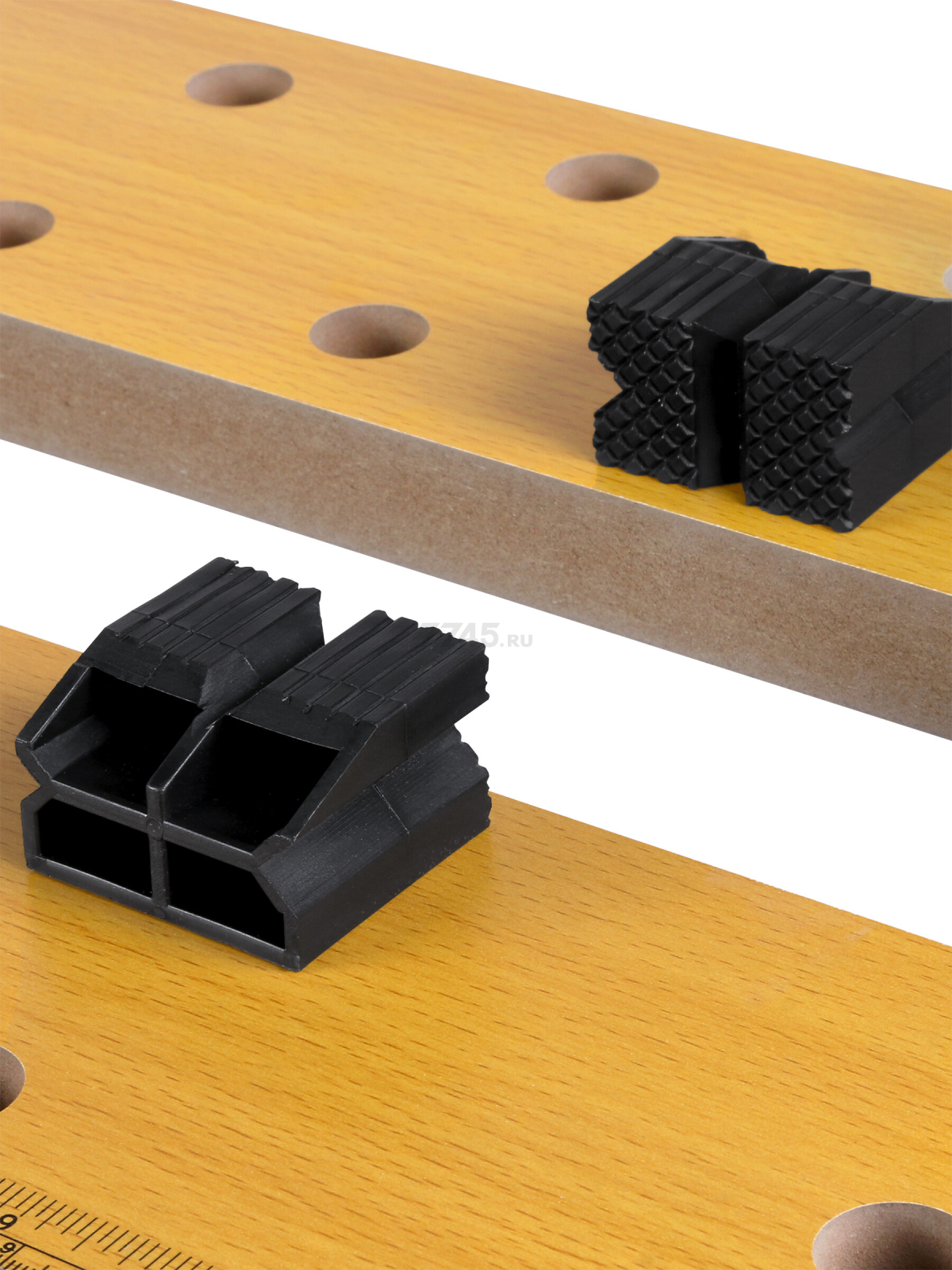 Встроенный механизм тисков и передвижные клинья-упоры дают возможность зажимать детали по ширине и под углом, освобождая руки для точной обработки, пиления или сверления.