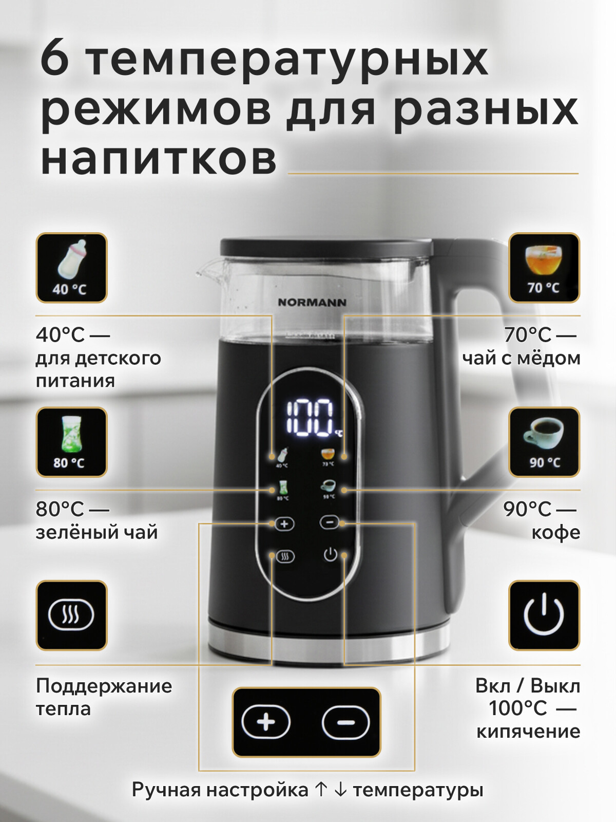 Чайник оборудован закрытой спиралью, индикатором уровня воды и сенсорным дисплеем, поддерживает выбор температуры 40, 70, 80, 90 и 100 °C и функцию поддержания температуры до 2 часов. Удобство эксплуатации обеспечивают подставка с возможностью вращения, отсек для шнура и автоматическое отключение при закипании или отсутствии воды. Прибор сочетает безопасность, практичность и современный дизайн.