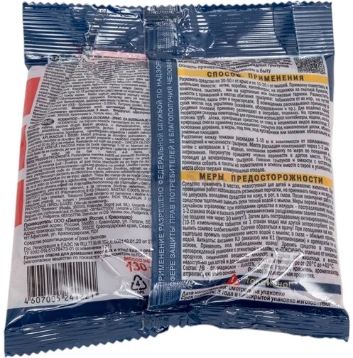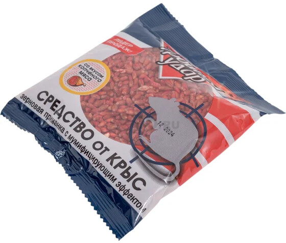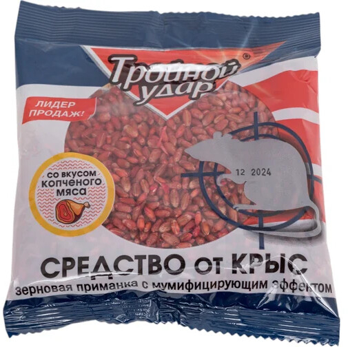 Отрава от грызунов ДОМОВОЙ ПРОШКА Тройной удар 130 г (4607005241221) обладает мумифицирующим эффектом. Является готовой к применению зерновой приманкой. Применяется для уничтожения крыс в жилых и нежилых помещениях, подвалах, погребах.