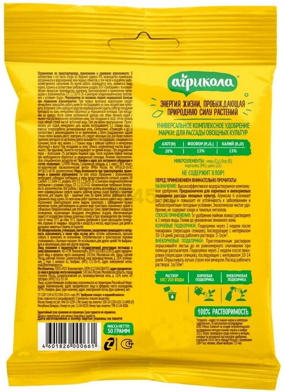 Удобрение минеральное для рассады АГРИКОЛА 50 г (4601826000661) включают полный сбалансированный набор макро- и микроэлементов, не содержат хлора и тяжелых металлов. Правильный состав, учитывающий потребности растения в тот или иной период роста, своевременные подкормки удобрениями Агрикола препятствуют образованию нитратов в растениях.