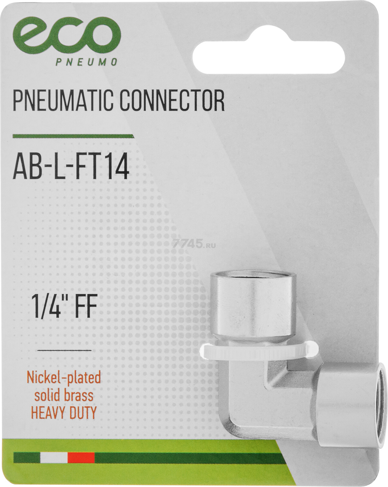 Переходник L-образное внутренняя резьба 1/4" ECO (AB-L-FT14) из высокопрочной латуни с никелированным покрытием, что повышает устойчивость к коррозии и износу.