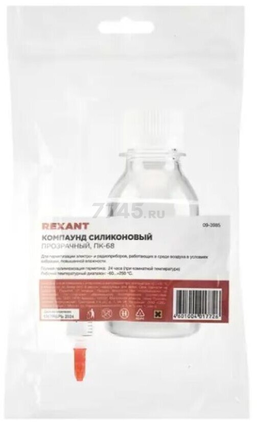 Компаунд силиконовый, прозрачный ПК-68 (двухкомпонентный) 100 гр REXANT предназначен для герметизации электро- и радиоприборов, работающих в среде воздуха в условиях вибрации, повышенной влажности в температурном интервале –60...+250 °C.