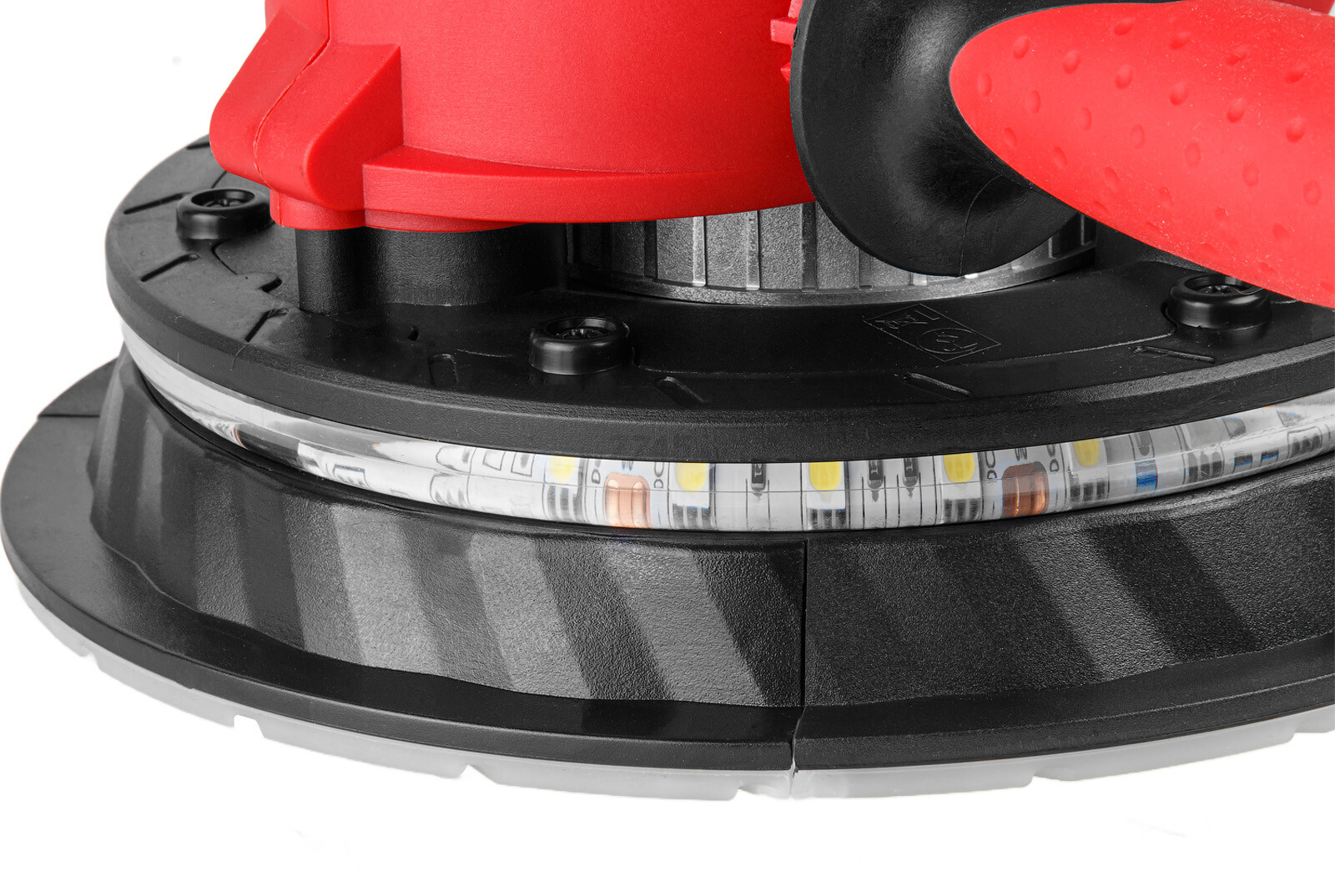 Система крепления шлифовальной бумаги с помощью липучки - для ее быстрой замены шлифкруга. Дополнительная рукоятка позволяет работать со шлифмашиной двумя руками, что сводит к минимуму риск потери контроля над инструментом. Наличие LED-подсветки обеспечивает эффективную работу на темном участке. Время очистки сводится к минимуму за счет использования пылесборного мешка, соединенного со шлифмашиной.