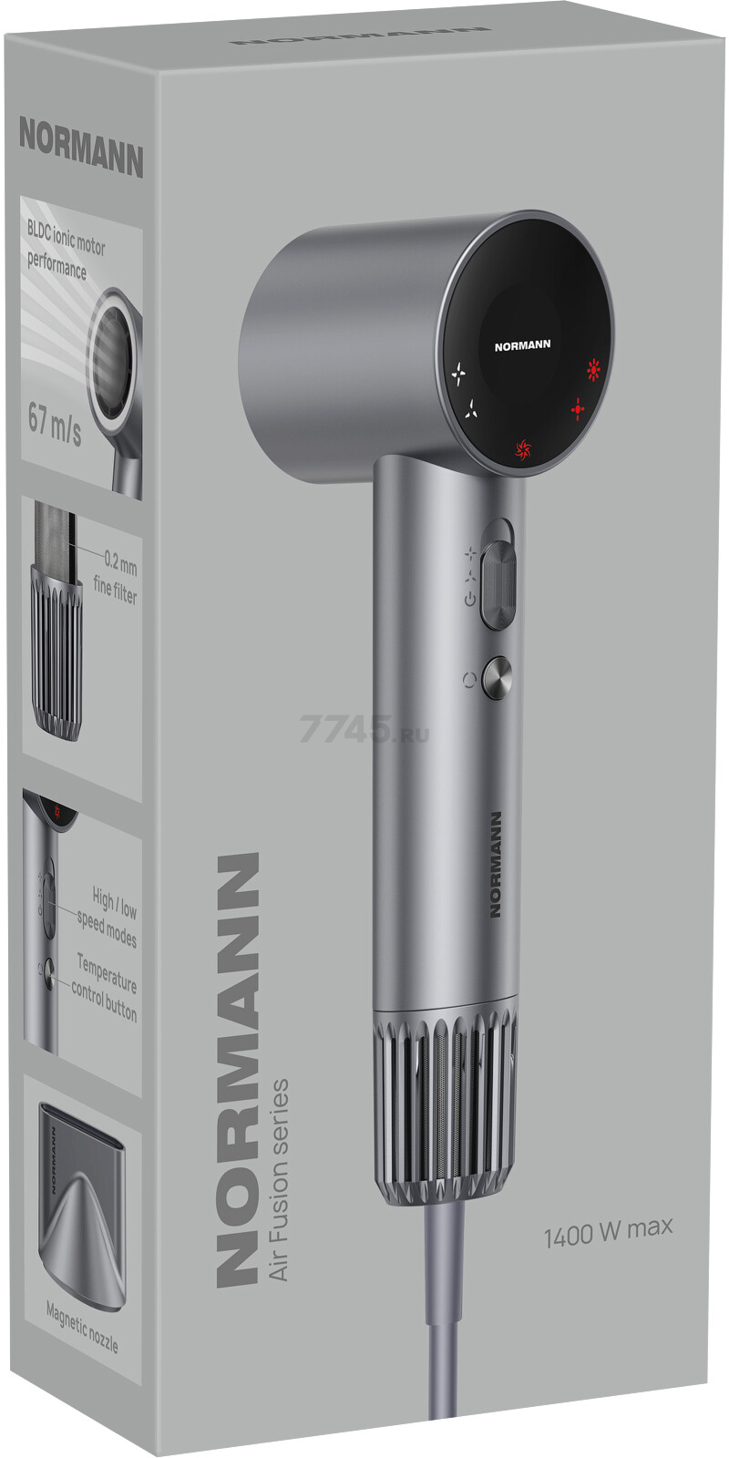 Фен NORMANN AHD-441 (N16060-2) — современный профессиональный фен с бесщеточным BLDC мотором мощностью 1200–1400 Вт, обеспечивающий высокую скорость воздушного потока до 67 м/с и 110 000 оборотов в минуту. Он сокращает время сушки волос вдвое и подходит для длинных, густых и влажных волос, сочетая эффективность и бережное отношение к структуре волос.