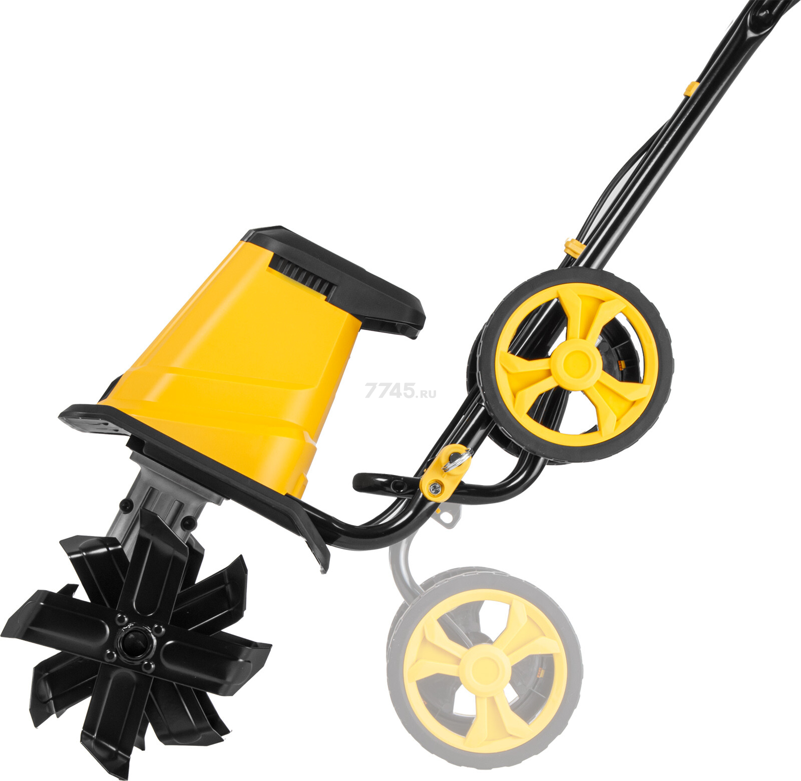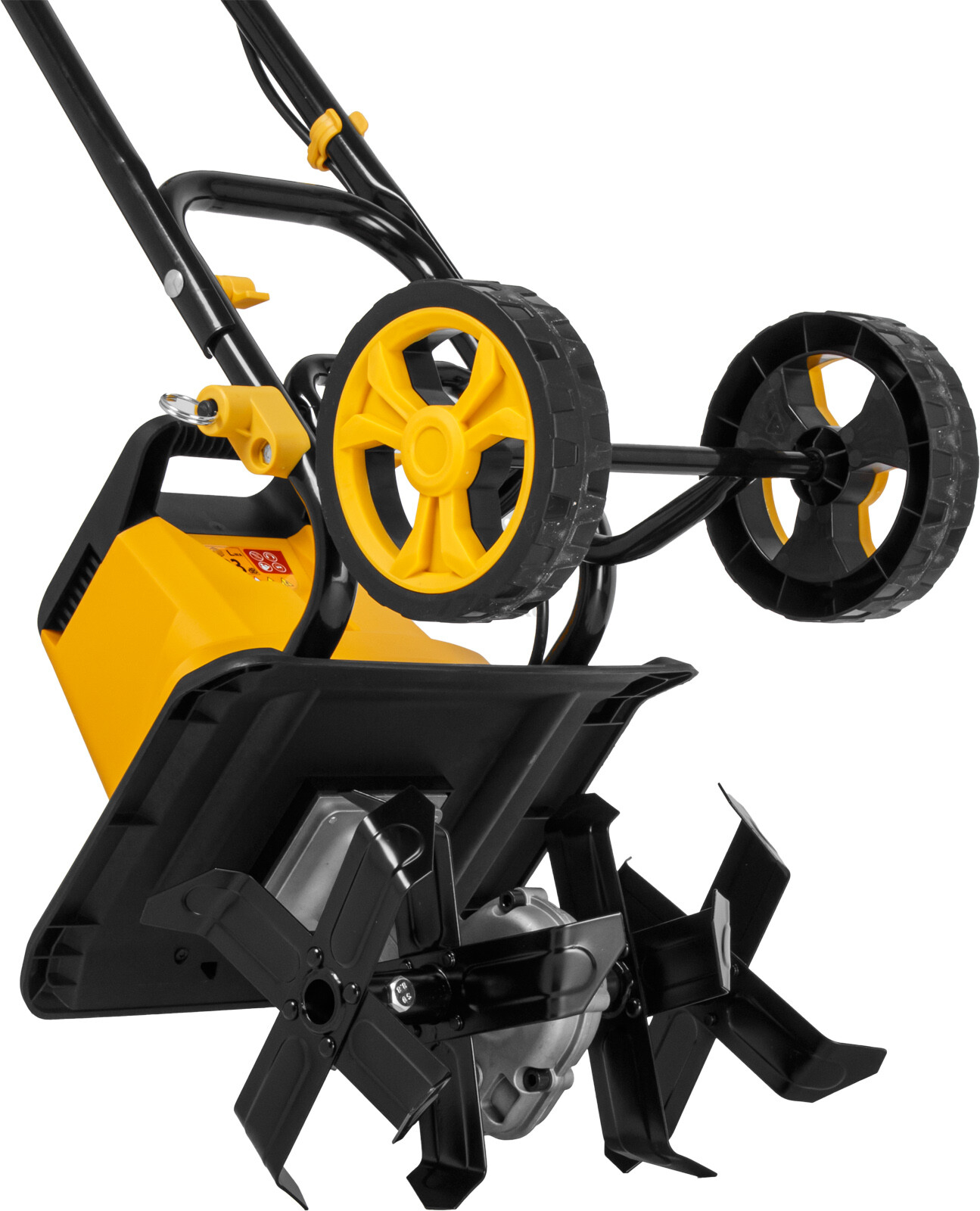 Задние колеса с кронштейном облегчают перемещение агрегата культиватора. Колеса могут быть зафиксированы в транспортировочном положении либо в рабочем;