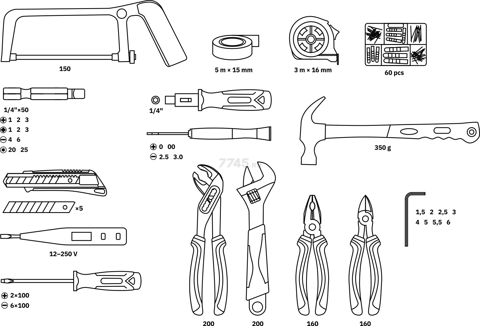 Ножовка 150 мм Нож пистолетный с выдвижным лезвием 18 мм Сменные лезвия для ножей 18 мм Набор крепежа (дюбели, шурупы) - 60 шт. Изолента 5 м x 15 мм Рулетка 3x16 м Клещи переставные 200 мм Ключ разводной 200 мм Бокорезы 160 мм Тонкогубцы 160 мм Тестер 12-250V |