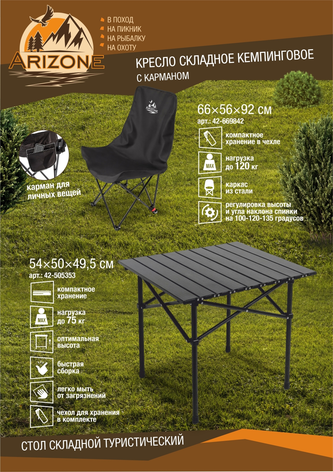 Стол складной ARIZONE черный (42-505353) — практичное и компактное решение для отдыха на природе, пикников, кемпинга, рыбалки, а также использования дома или на даче. Конструкция стола легко складывается, благодаря чему его удобно транспортировать и хранить. В сложенном виде стол занимает минимум места, что делает его удобным для перевозки в автомобиле.