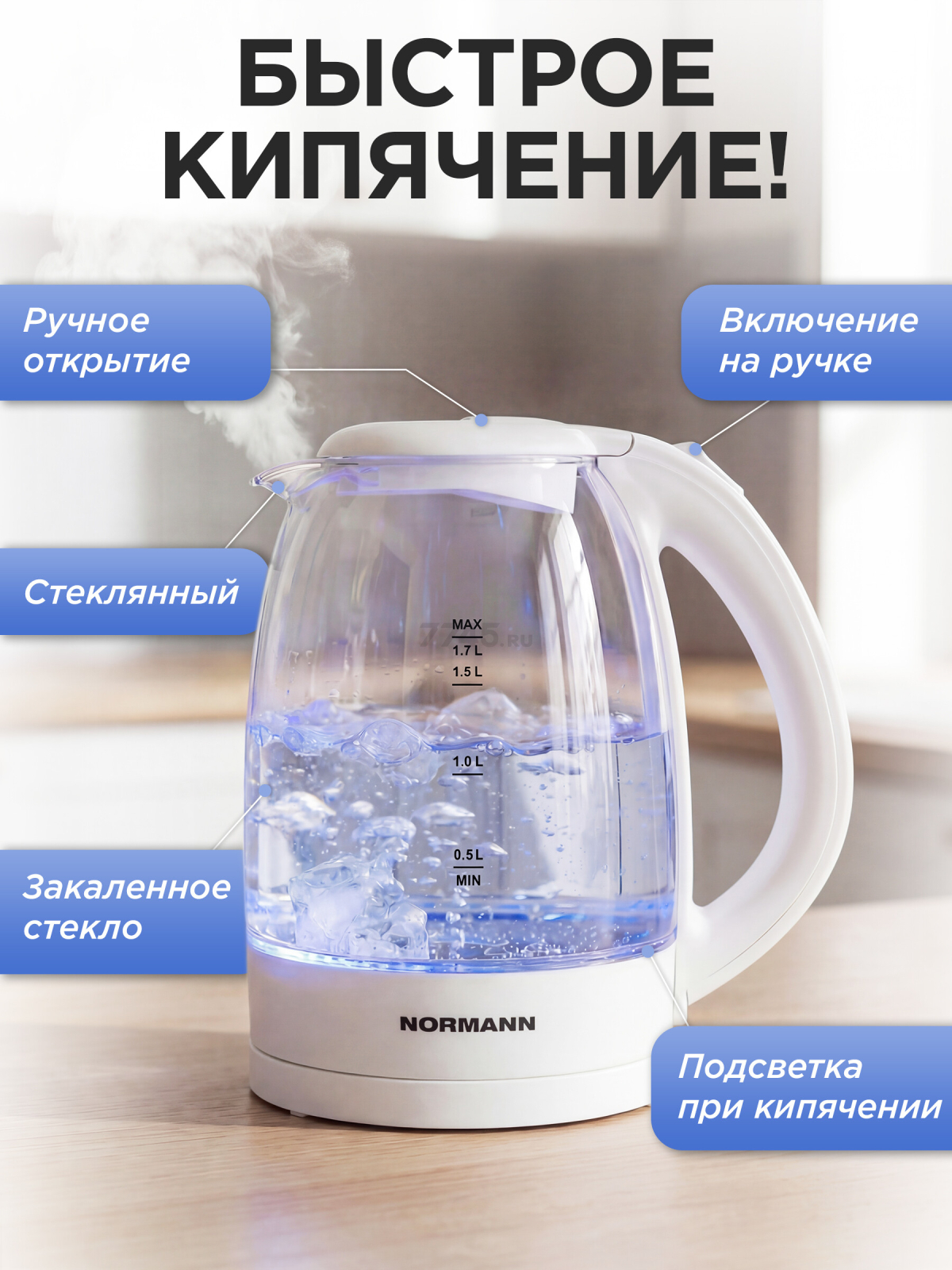 Чайник электрический NORMANN AKL-239 (N16039-5) — современный бытовой прибор, предназначенный для быстрого и безопасного кипячения воды. Его объем 1,7 литра делает его удобным для использования дома и в офисе, а корпус из высококачественного закаленного стекла придает прибору стильный и современный вид.