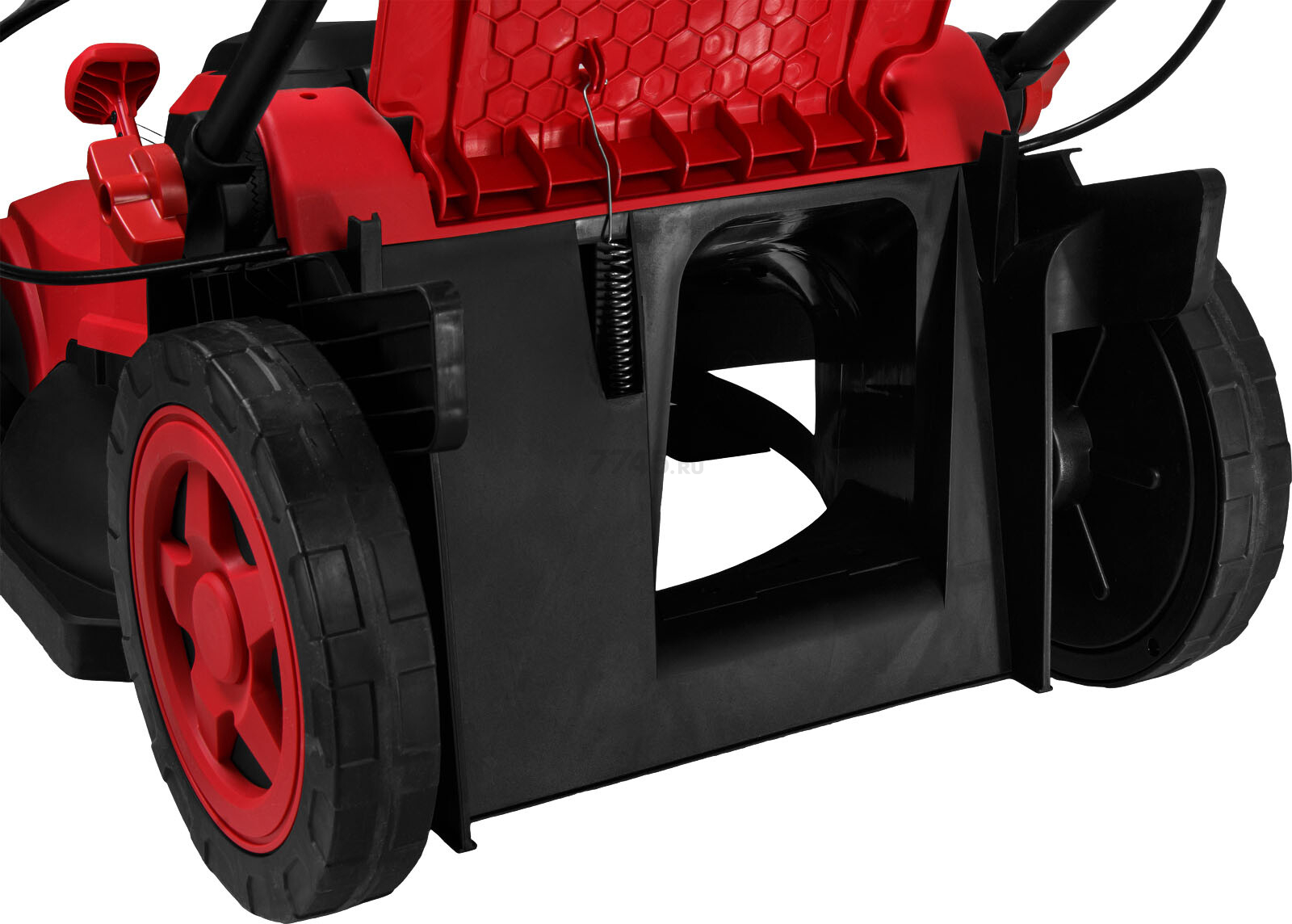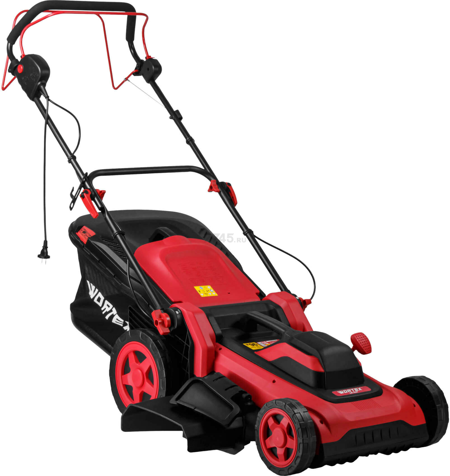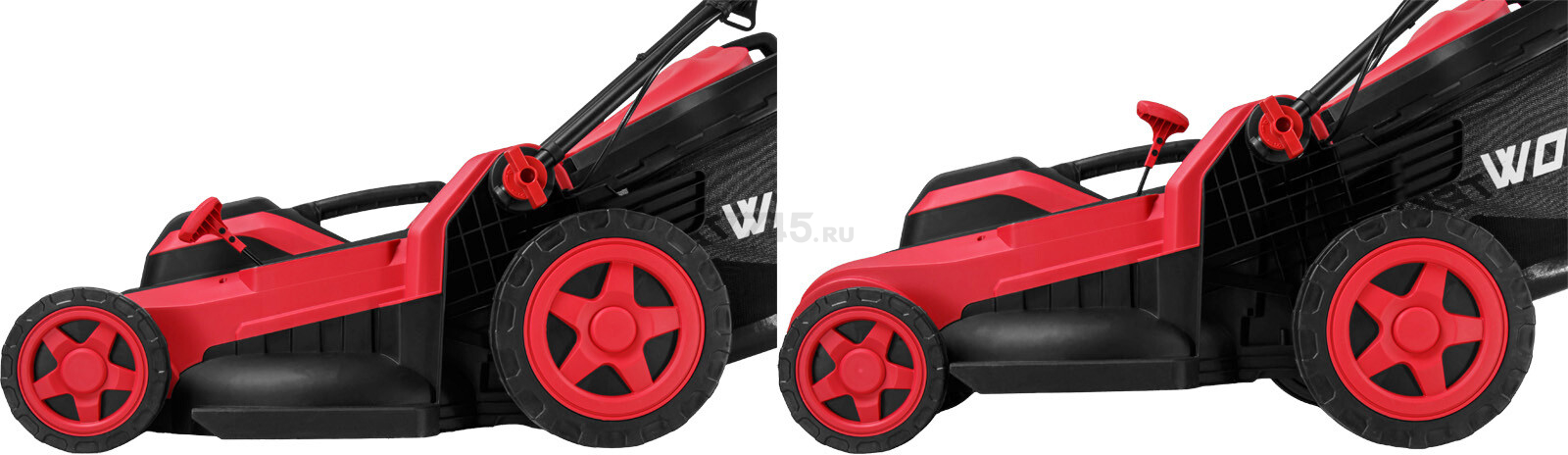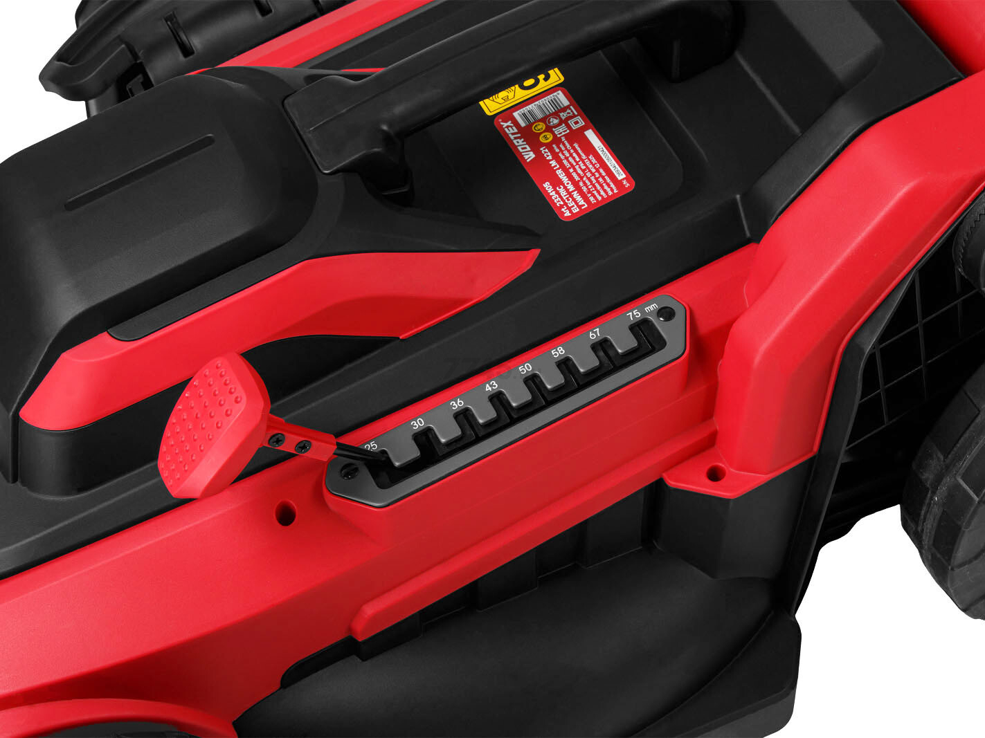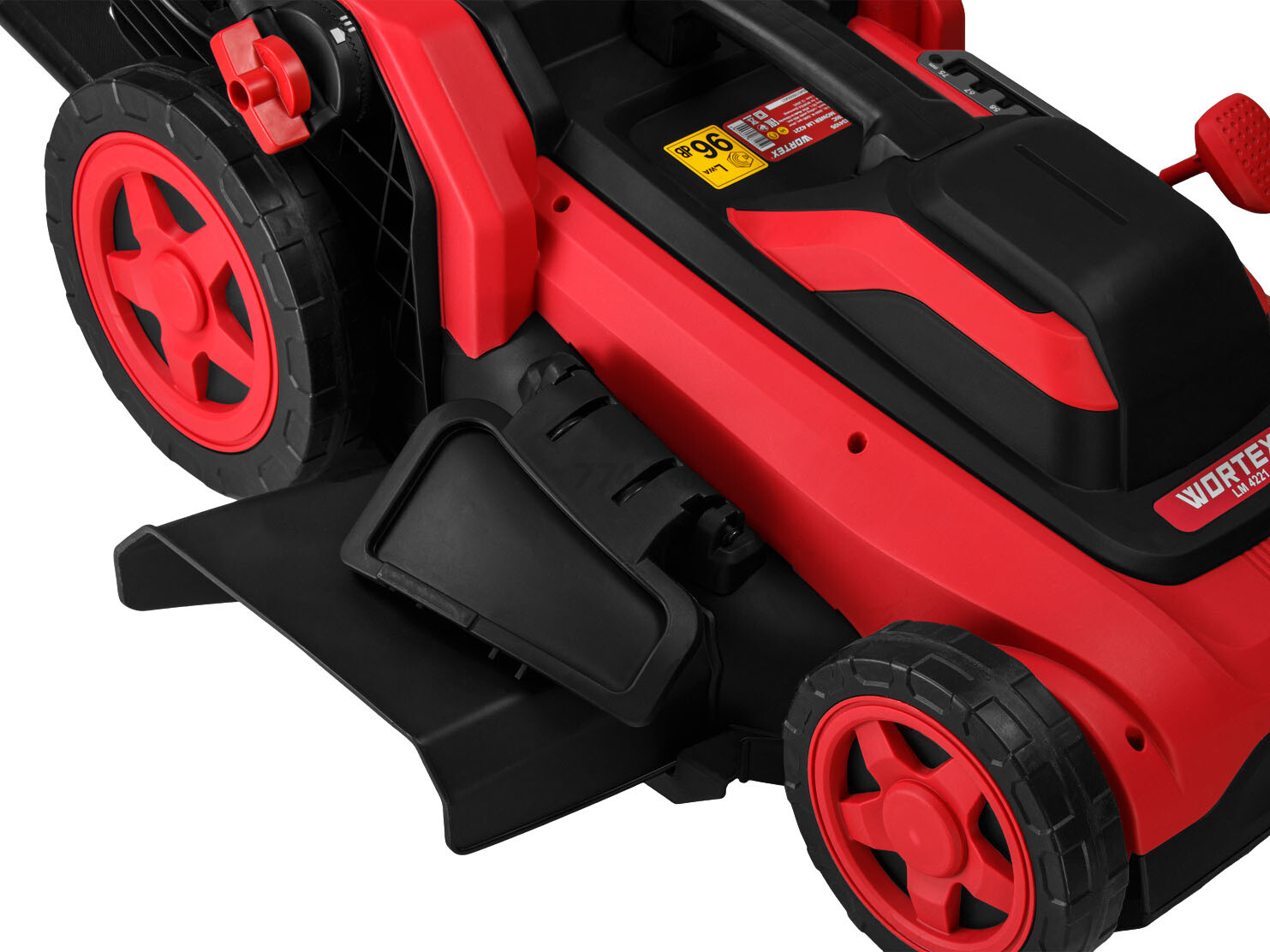 Газонокосилка электрическая WORTEX LM 4221 (2334105) оснащена мощным двигателем на 2 кВт с защитой от перегрева, имеет большие колеса (250/180 мм) и удобную рукоятку с мягкой накладкой и большими скобовидными рычагами выключателя и подключения привода.