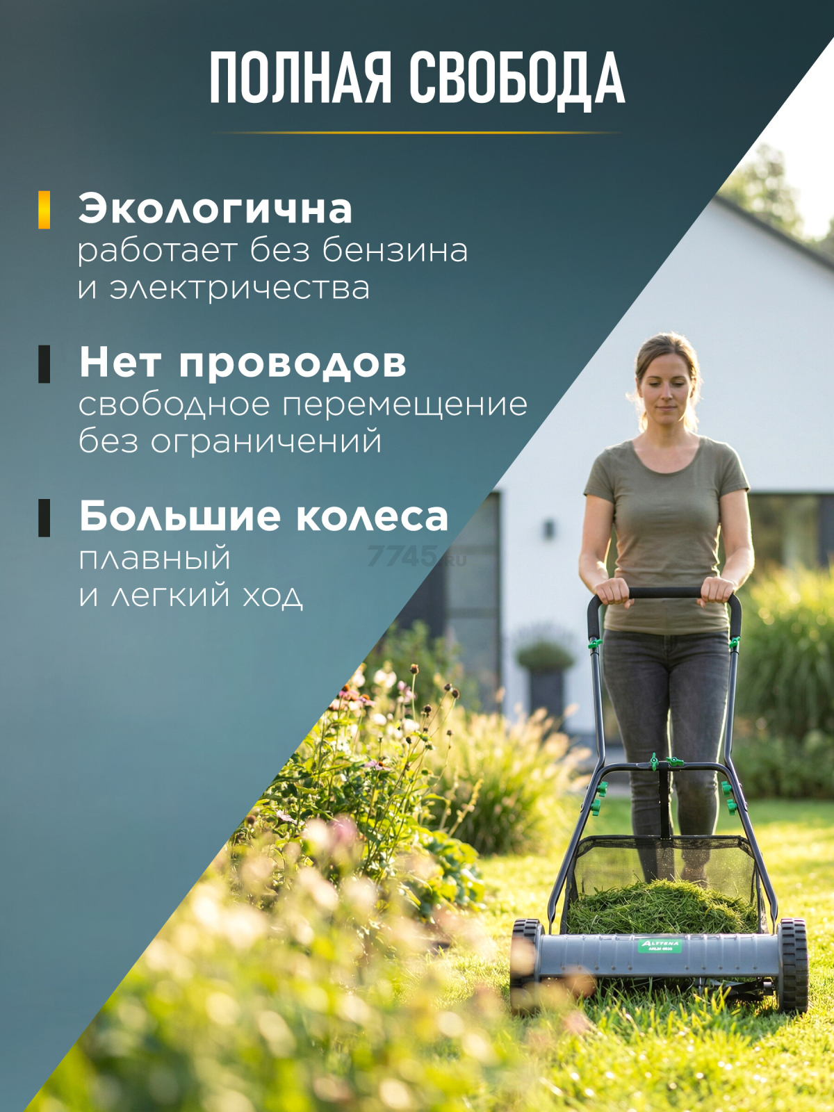 Газонокосилка механическая ALTTENA AHLM 4035 (300601) - это надежный и практичный инструмент для аккуратного ухода за газоном. Благодаря простоте конструкции и ручному принципу работы, она идеально подходит для тех, кто ценит экологичность, экономичность и легкость в эксплуатации. Вал с лезвиями приводится в действие движением колес, что обеспечивает полную свободу перемещения во время работы.