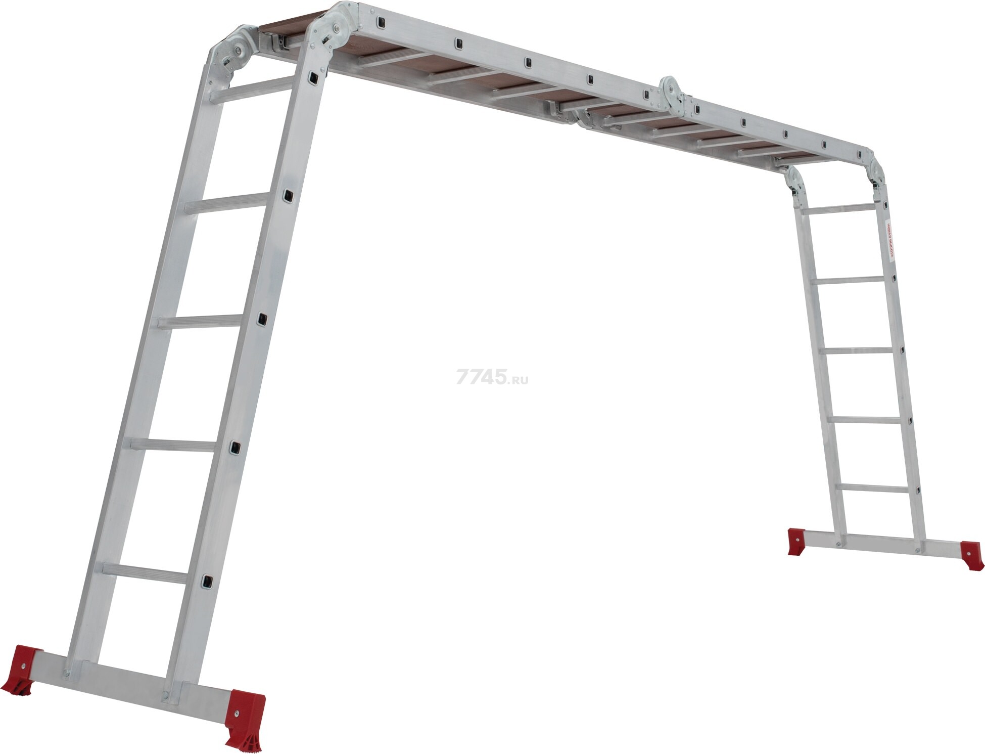 Лестница-трансформер алюминиевая 551 см НОВАЯ ВЫСОТА NV2330 (2330405) приставная лестница, стремянка, приставная согнутая лестница, помост с настилом. В комплекте съёмный настил для положения помост. Лёгкий в установке и компактный в транспортном положении. Максимальная прочность и надёжность при небольшом весе изделия. Ступени с рифлением для безопасного подъёма и спуска. Стойки и ступени изготовлены из прессованного алюминиевого профиля. Стойки с дополнительным усилием в наиболее нагруженных местах для повышенной прочности. Многократная развальцовка в соединении ступеней со стойками обеспечивает высокую прочность и долговечность. Шарнирные замки регулируются одной рукой. Надёжная автоматическая фиксация. Широкие поперечные траверсы обеспечивают высокую устойчивость при работе во всех положениях. Башмаки траверсы препятствуют скольжению. Они надёжно закреплены с помощью заклёпок. Максимальная нагрузка 150 кг.