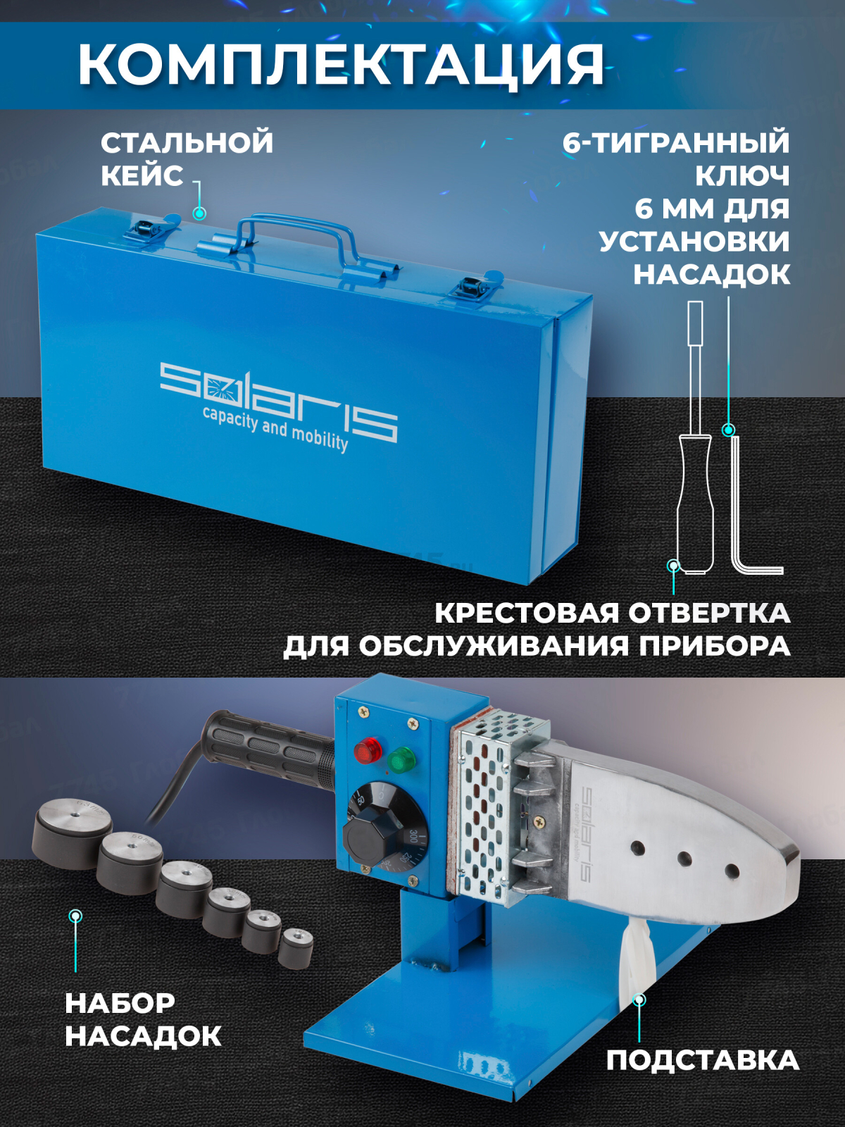 Сварочный аппарат для полимерных труб SOLARIS PW-1002 мощностью 1000 Вт с регулировкой температуры и оснащенный 6-ю насадками от 20 до 63 мм - оптимальный выбор для проведения разнообразных сантехнических работ.