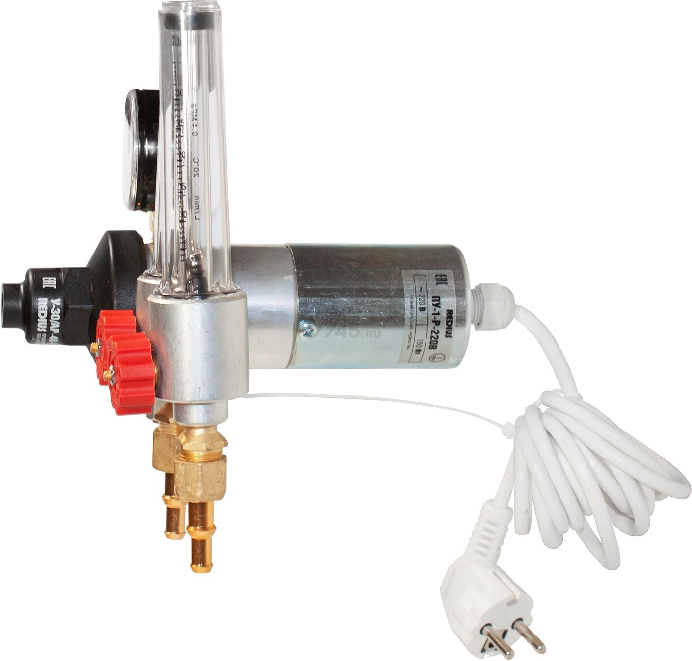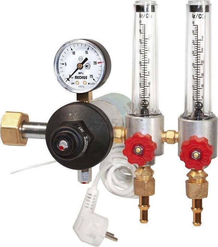 Регулятор комбинированный РЕДИУС У-30/АР-40-КР1П1-Р2 (05118) с ротаметром, баллонный одноступенчатый, предназначен для понижения и регулирования давления углекислого газа или аргона, поступающего из баллона, и автоматического поддержания постоянного рабочего расхода газа на выходе регулятора в ходе проведения работ. Подогреватель используется для предотвращения замерзания механизмов редуктора при больших расходах газа или при низких температурах окружающей среды. Подогрев осуществляется за счет теплообмена между газом и горячими стенками корпуса подогревателя.