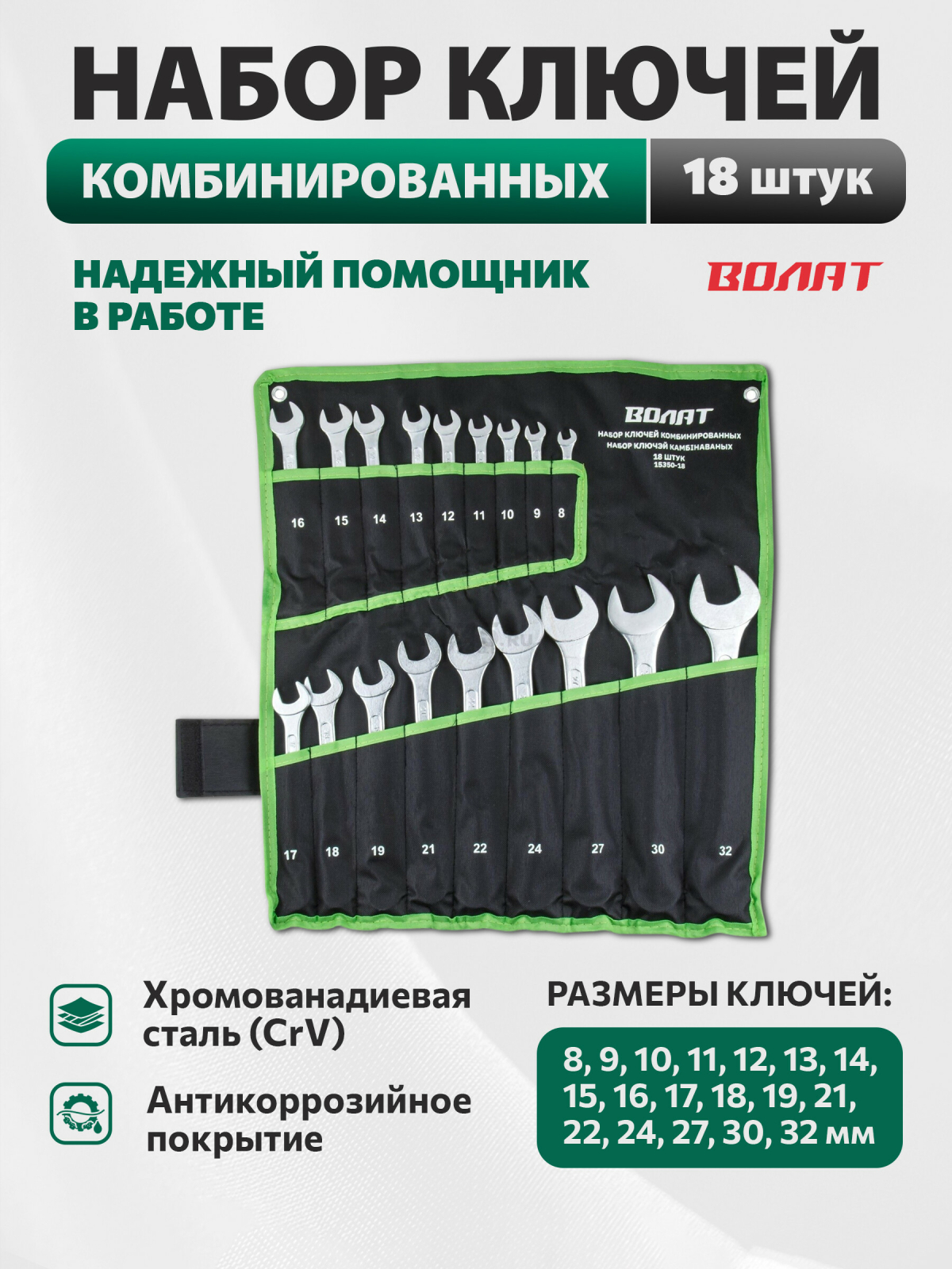Информация о товаре Набор ключей комбинированных 8-32 мм 18 предметов ВОЛАТ (15350-18)